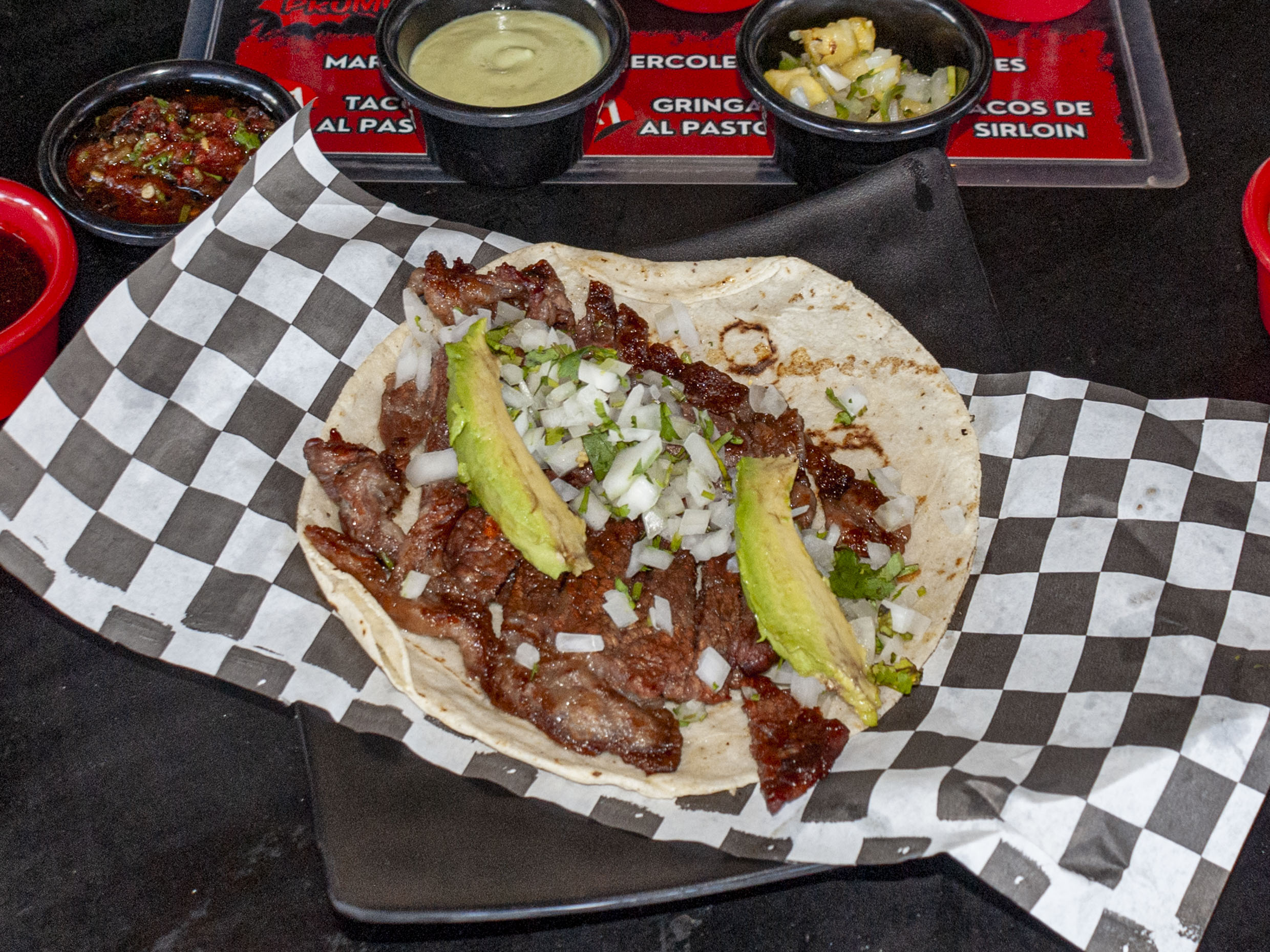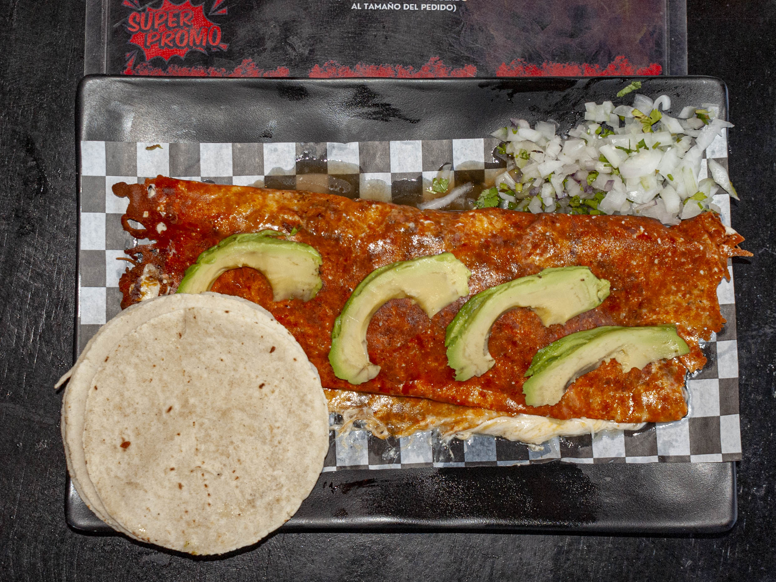 Deliciosa mega gringa acompañada con guacamole y la carne asada al carbón de tu elección.