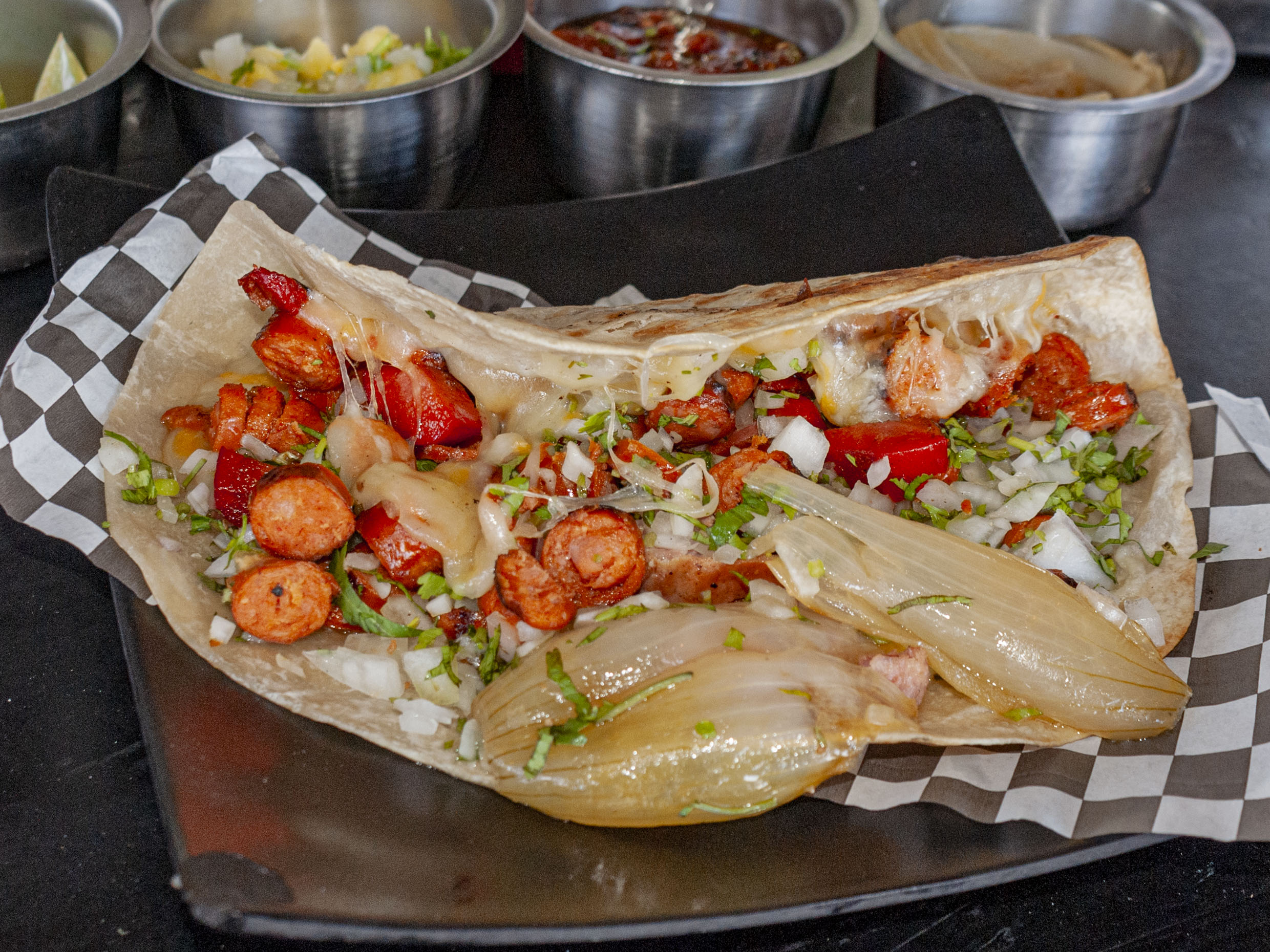 Incluye: mix de embutidos, salsa mexicana, crema de aguacate, salsa de piña con habanero, salsa tatemada, cebolla asada con chile toreado y tortilla de maíz