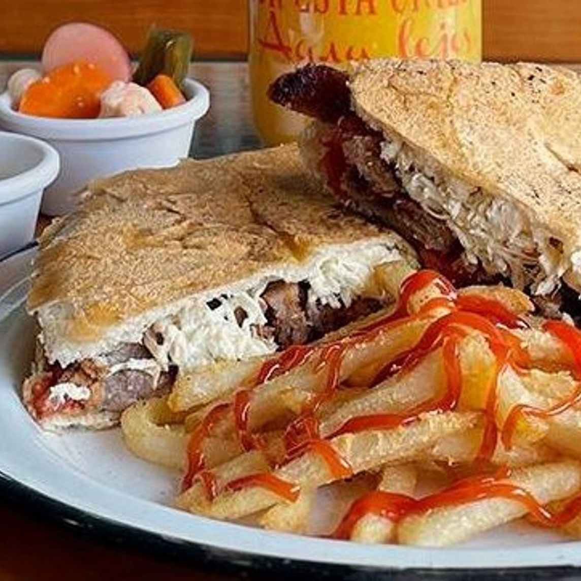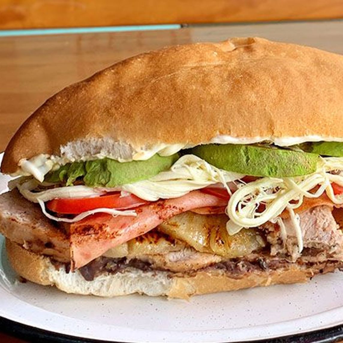 Jamón de pierna con queso amarillo u Oaxaca. Incluye torta planchada, papas combo y agua de 1/2 litro.