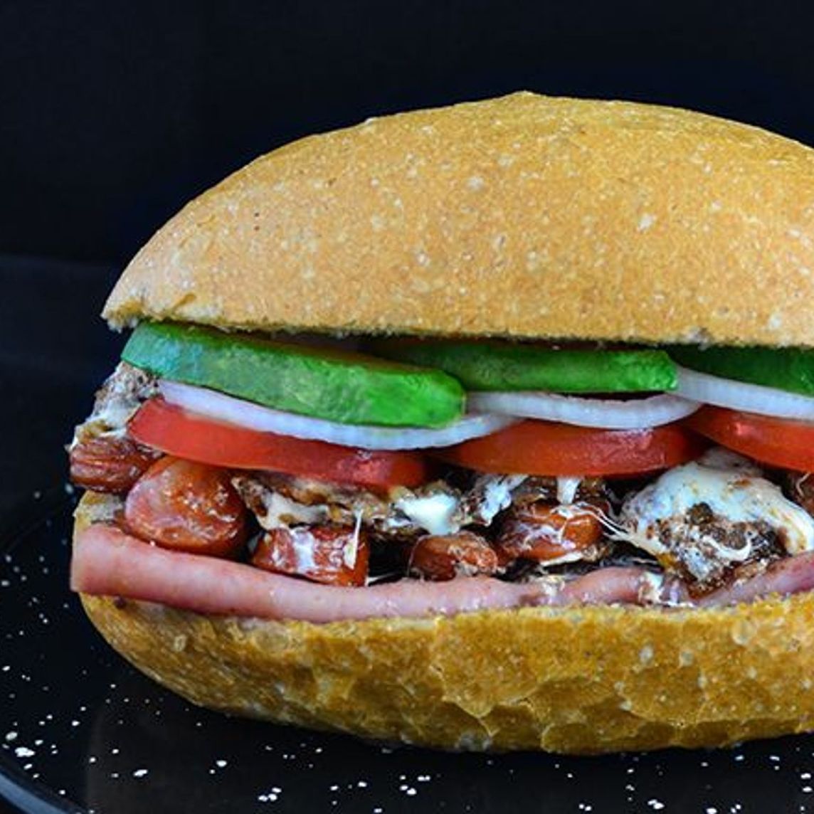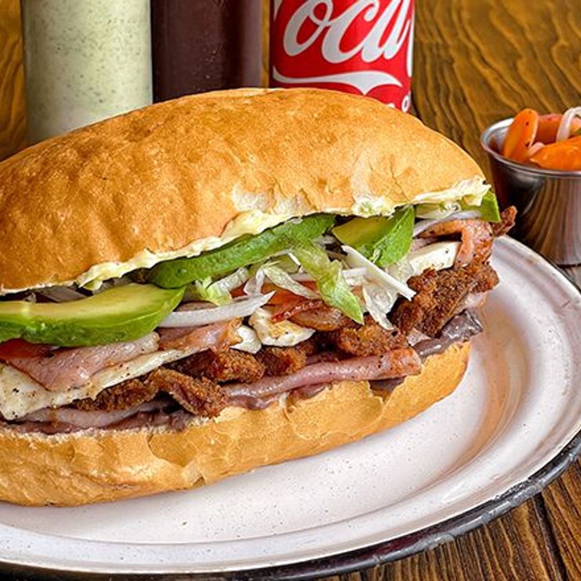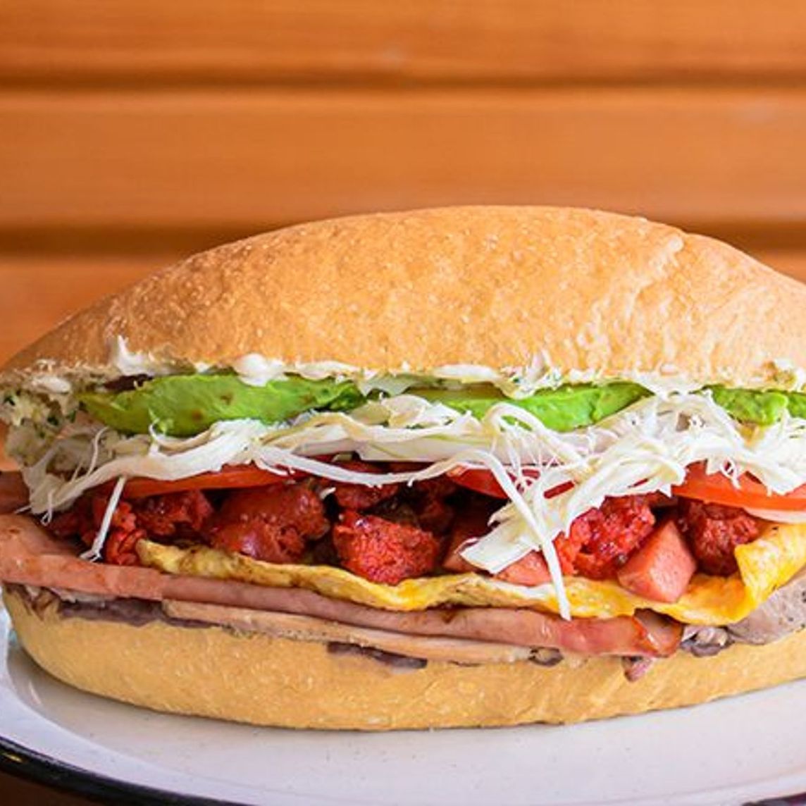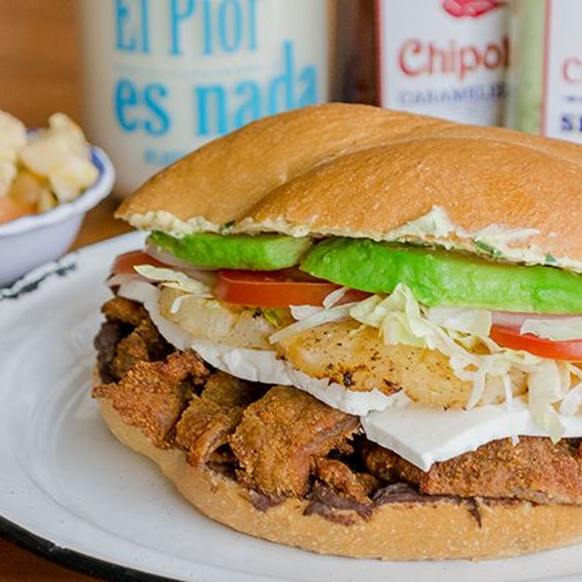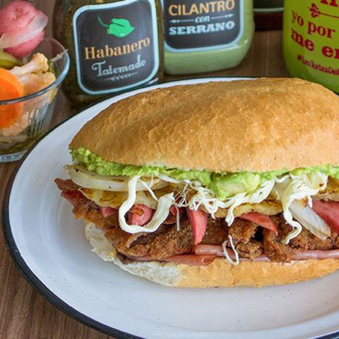 Milanesa, jamón de pierna, chistorra y queso Oaxaca fundido, va sin lechuga