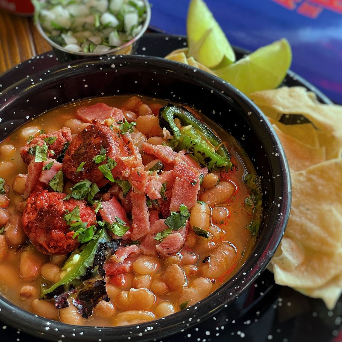 Recién sacados de la olla, preparados con nuestra mezcla de carnes y embutidos y ligeramente guisaditos, servidos con totopos y cebollita blanca.