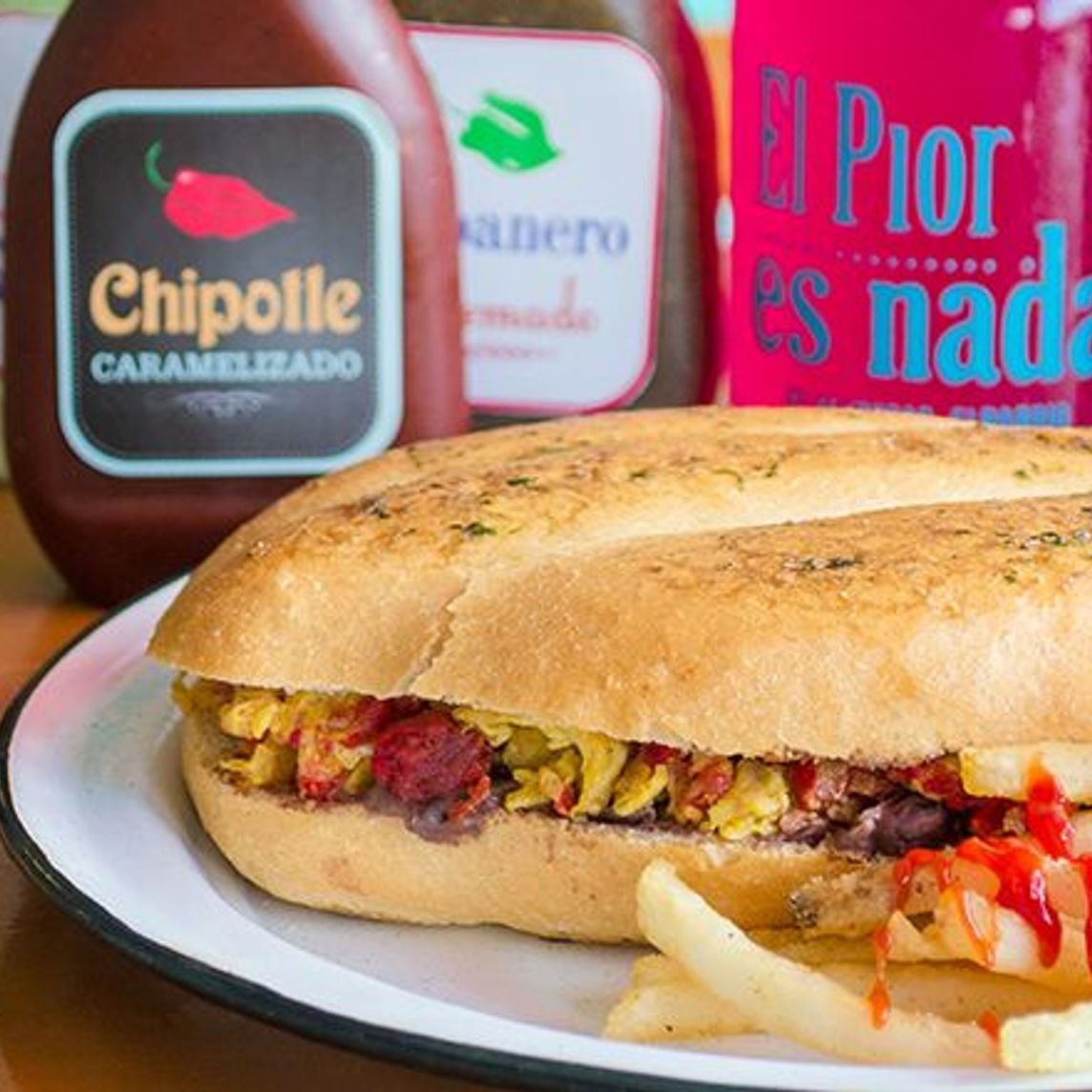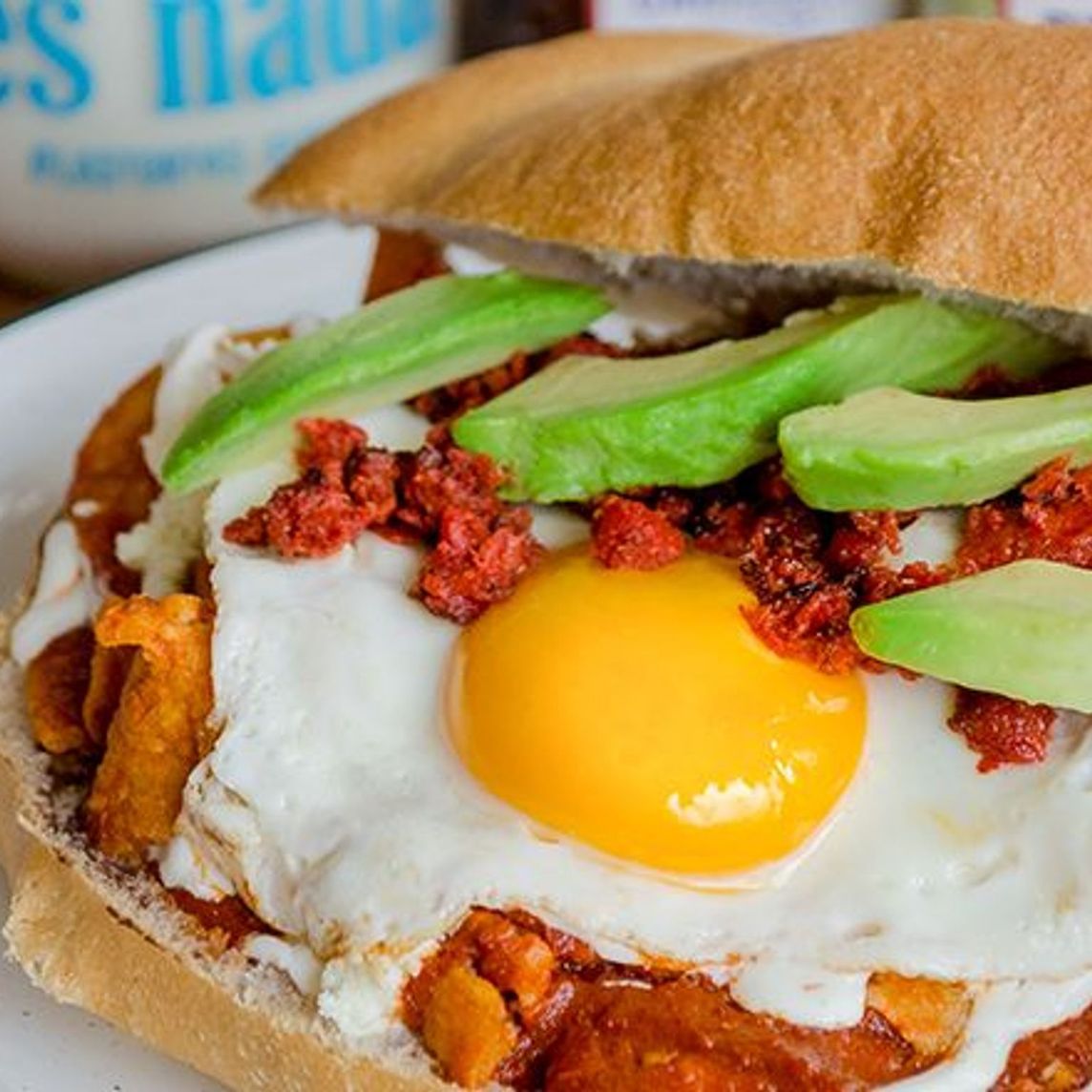 Con huevos ahogados en salsa de tu elección, chorizo, queso gratinado y extra de aguacate
