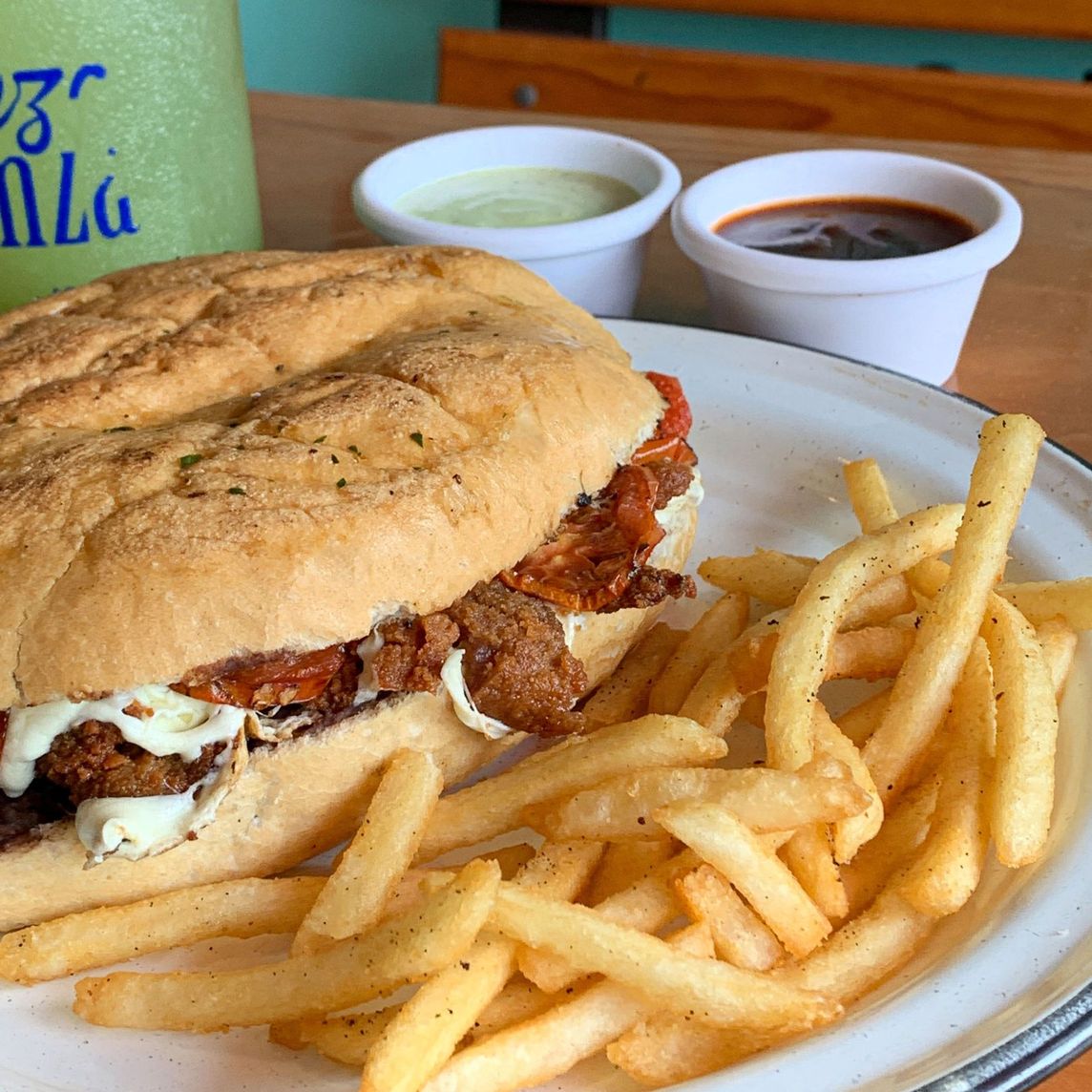 Milanesa, tomates asados y queso oaxaca. Incluye papas combo y agua de 1/2 litro.