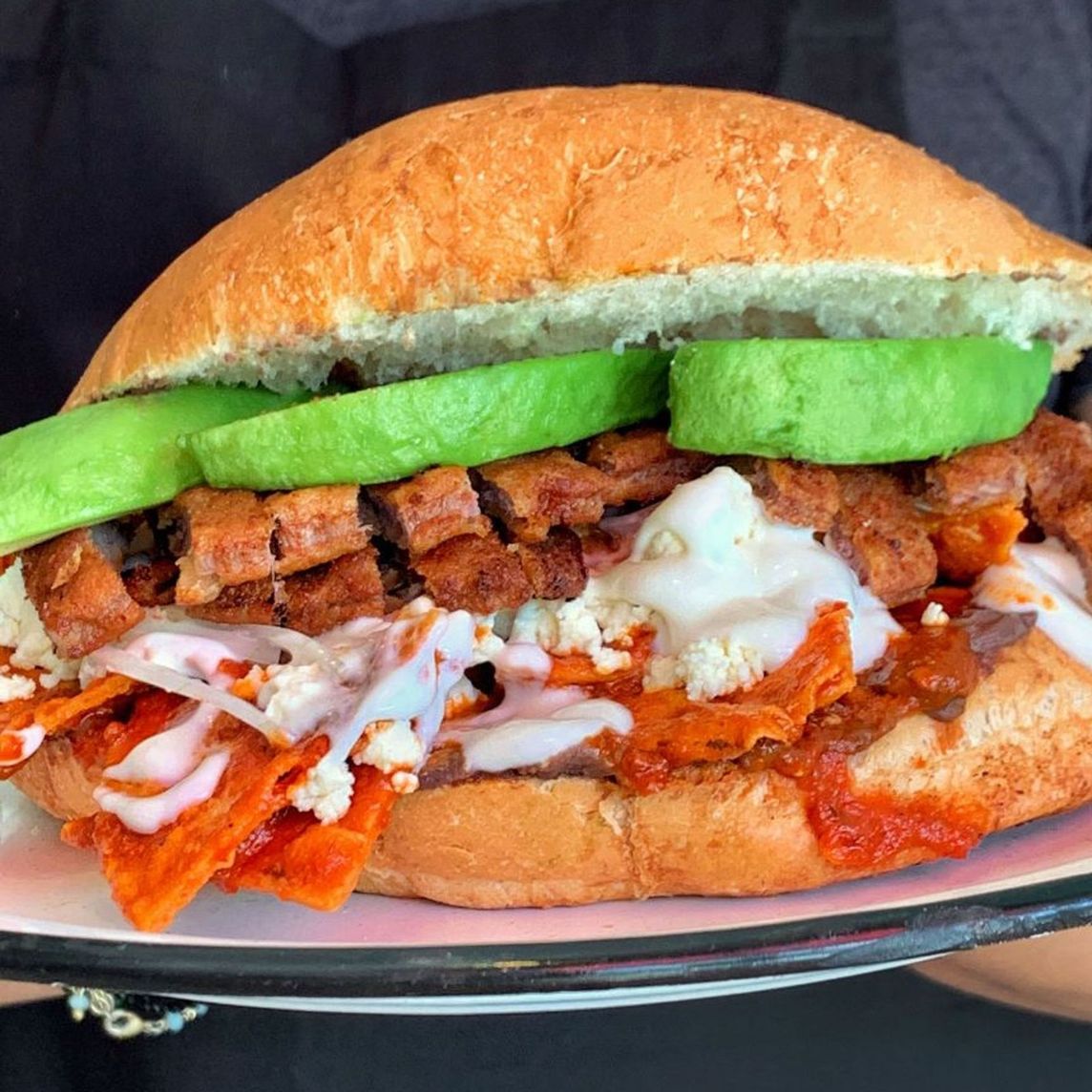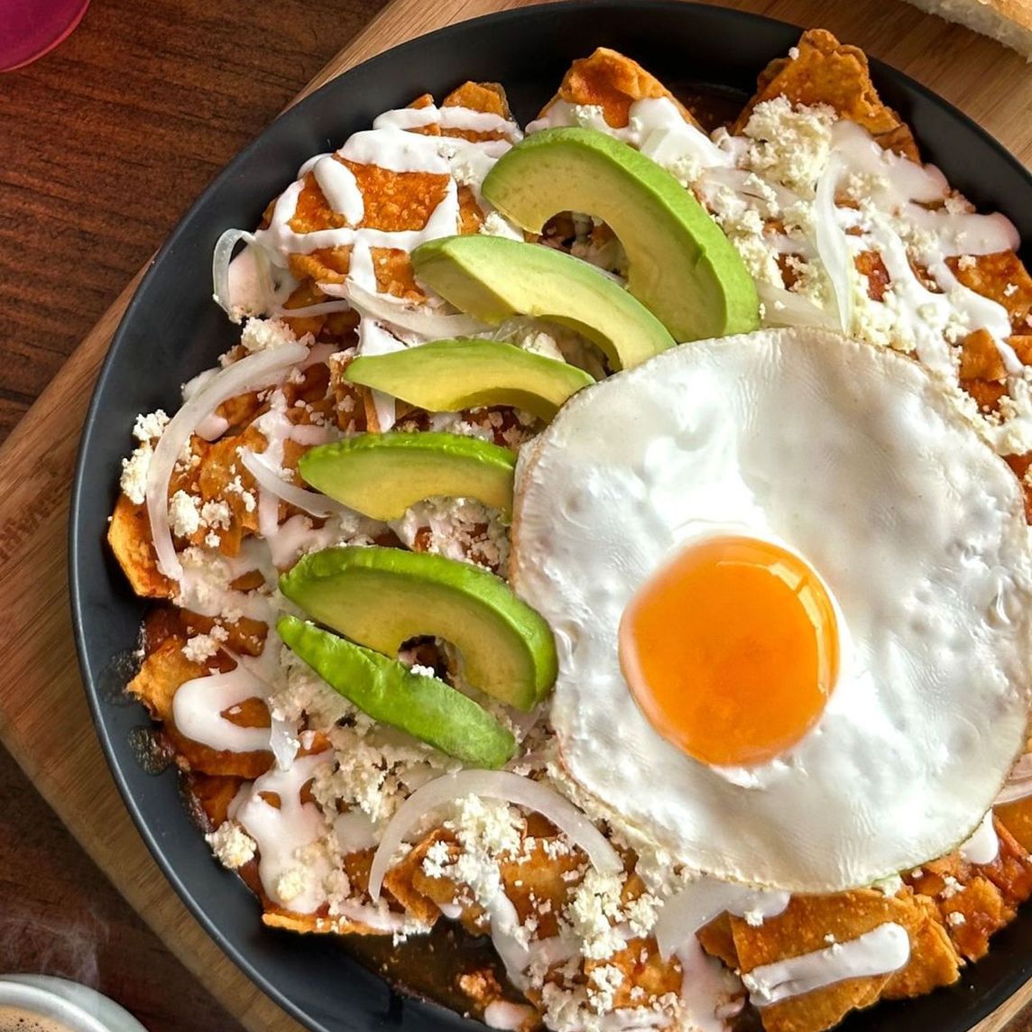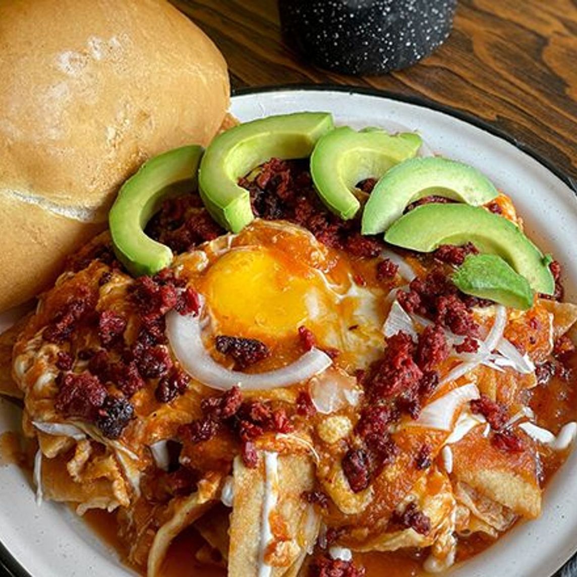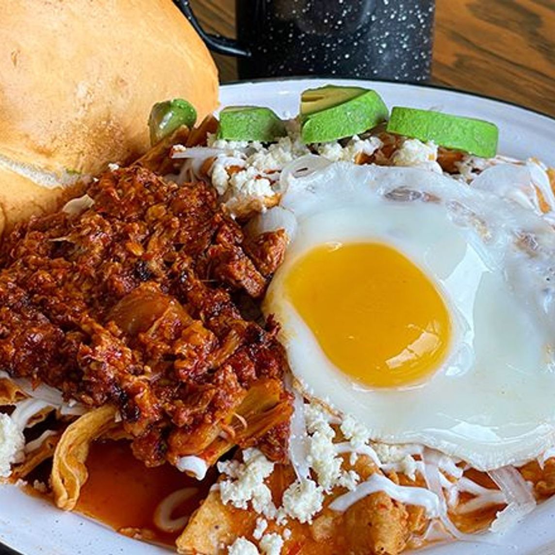 Chilaquiles con chicharron prensado, huevo revuelto o estrellado y extra de aguacate.