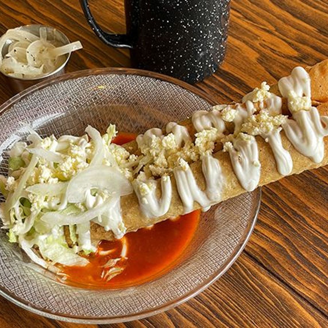 Orden de dos flautas servidas con salsa, lechuga, crema, queso fresco y cebolla.