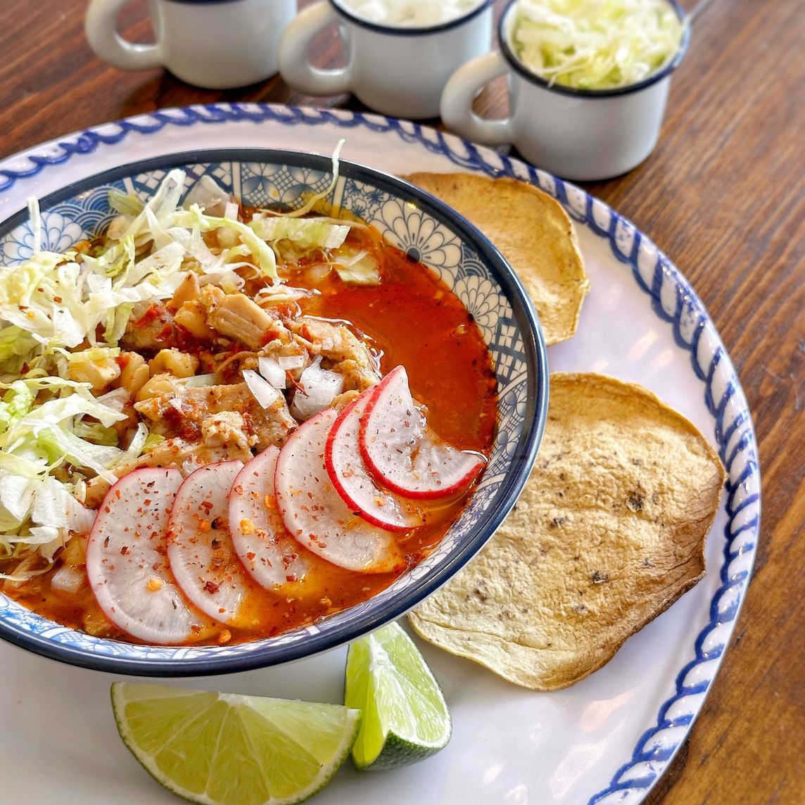 Servido con maciza y costilla, acompañado con lechuga, rábanos, cebolla, limones, totopos y nuestra mezcla de polvos de especias.