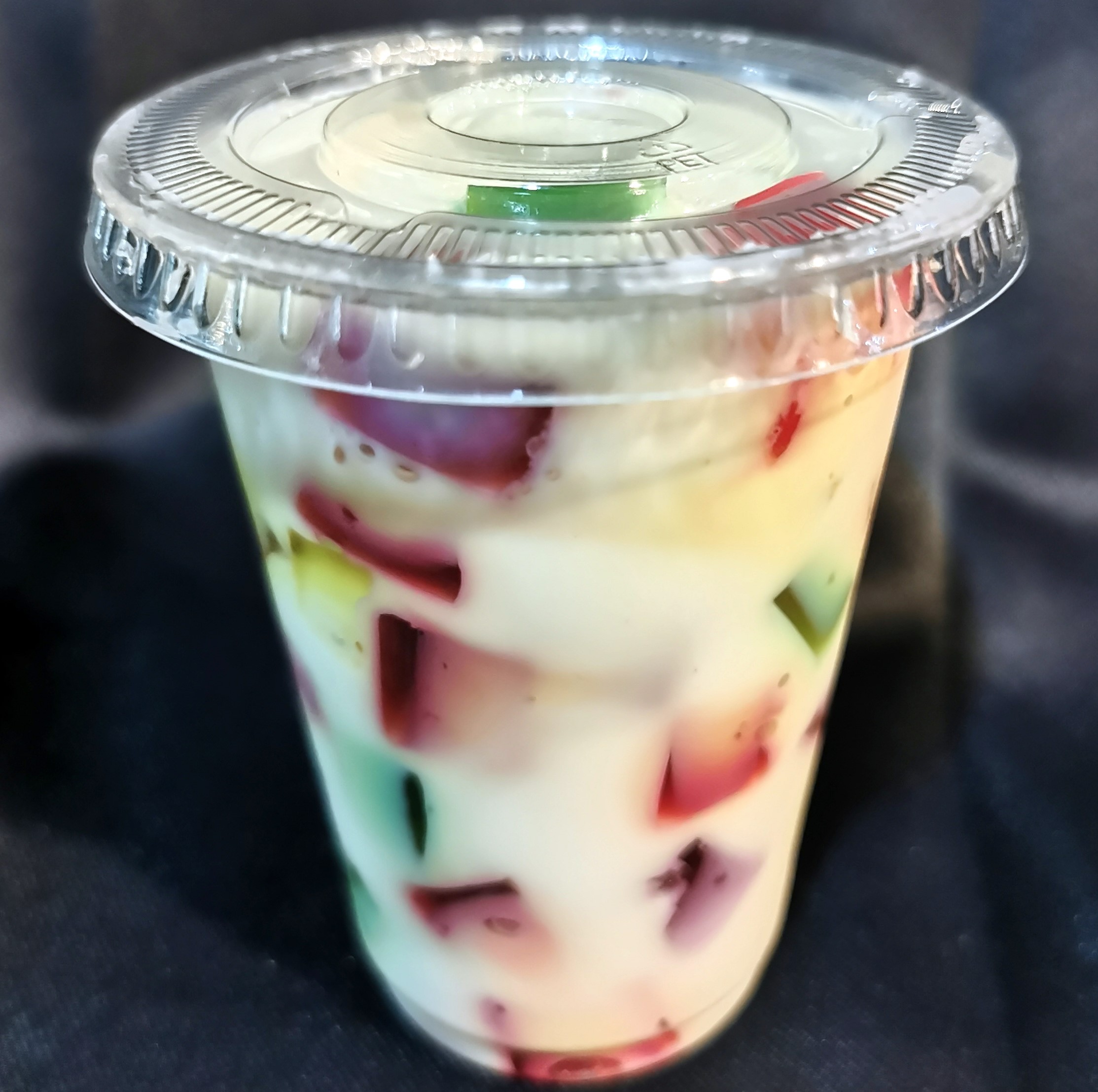 Postre elaborado con una deliciosa combinación de leches preparadas y un ligero toque de ron y vainilla, mezclado con trocitos de gelatinas de varios sabores (piña, fresa, limón, uva y naranja).