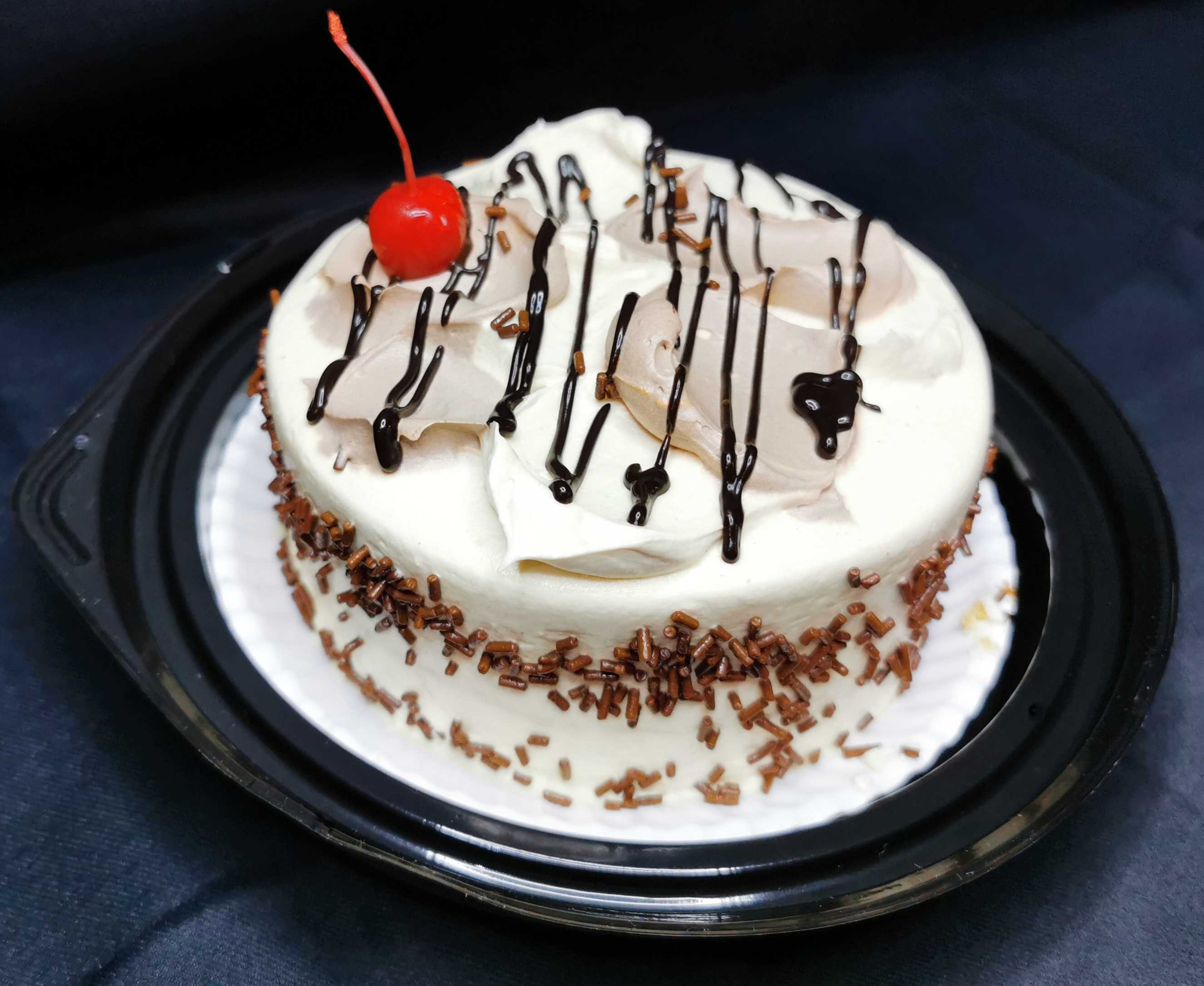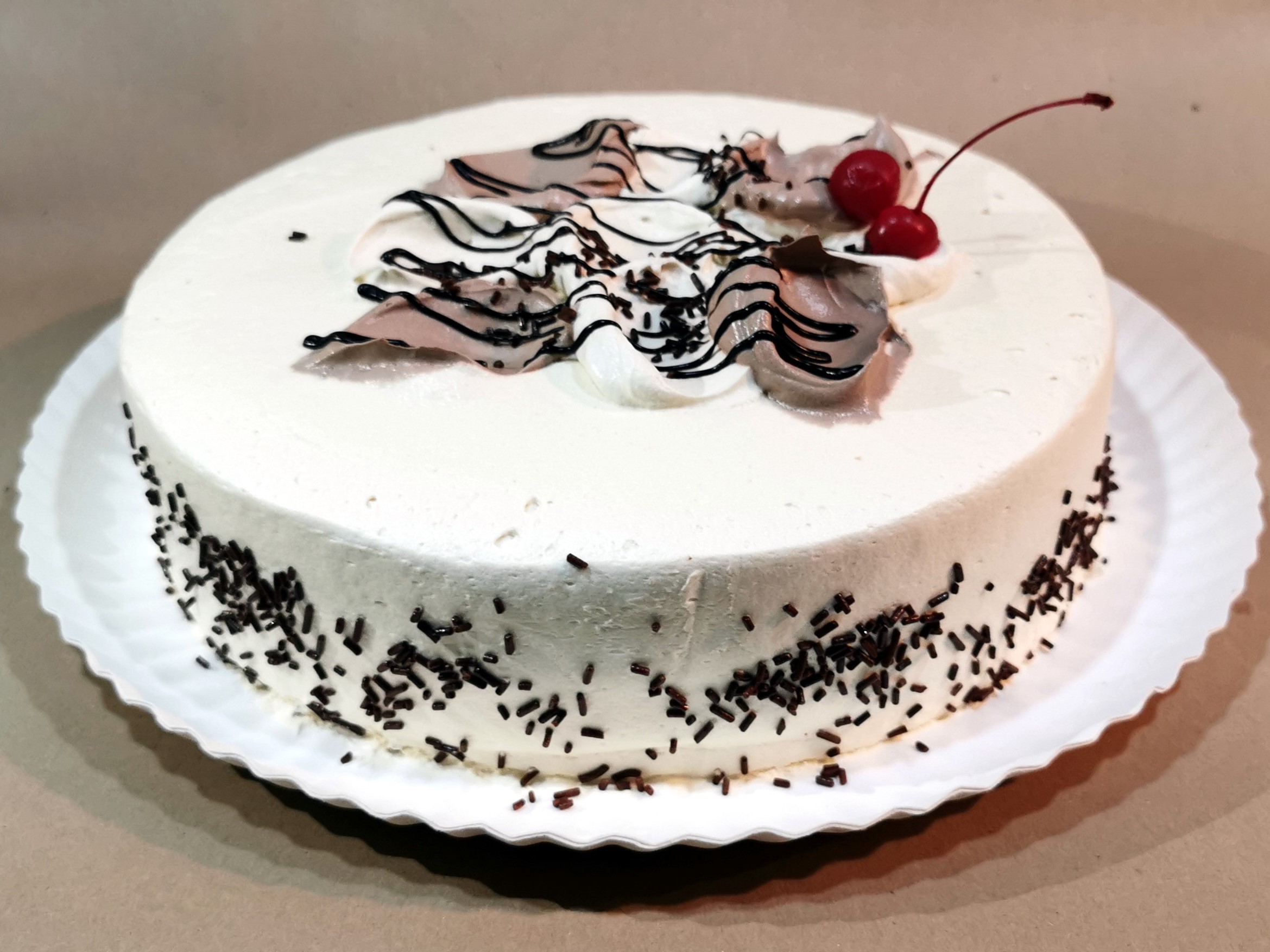 Delicioso Pan de vainilla mojado al 100 % con nuestro exquisito rompope de la casa, relleno y cubierto con una deliciosa crema para café montada con una mezcla de rompope de la casa; decorado con chocolate Blanco y Chocolate semi-amargo (CACEP) en forma de hojuelas en la falda