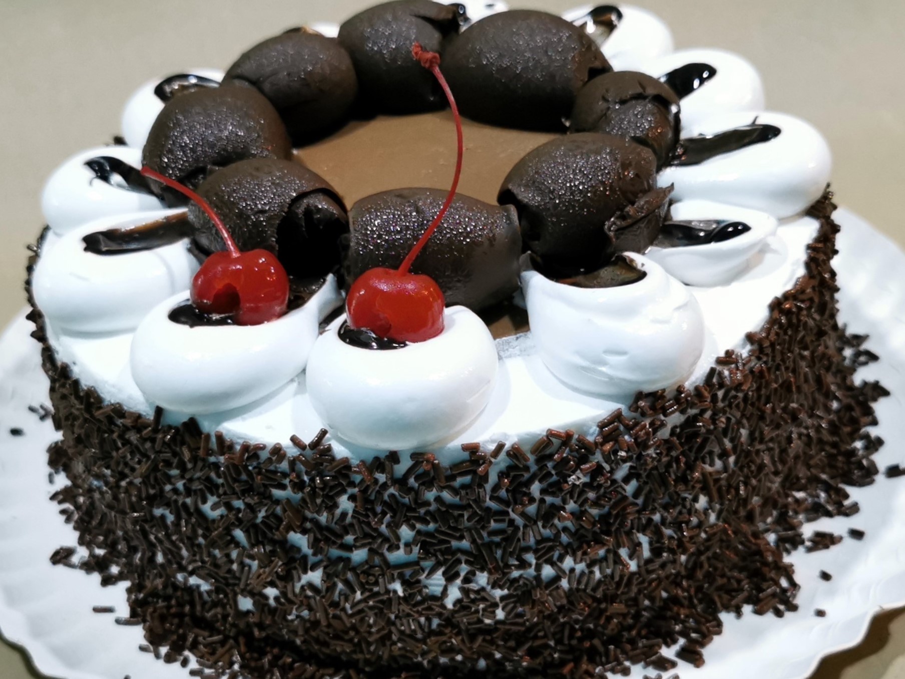 Delicioso y exquisito pan de chocolate, mojado en 3 leches, relleno y bañado de fudge (preparación a base de crema pastelera y chocolate real) decorado con ganashsabor chocolate y rosetones de chocolate fudge, con un rico centro de nuez molida y acompañado de cereza.