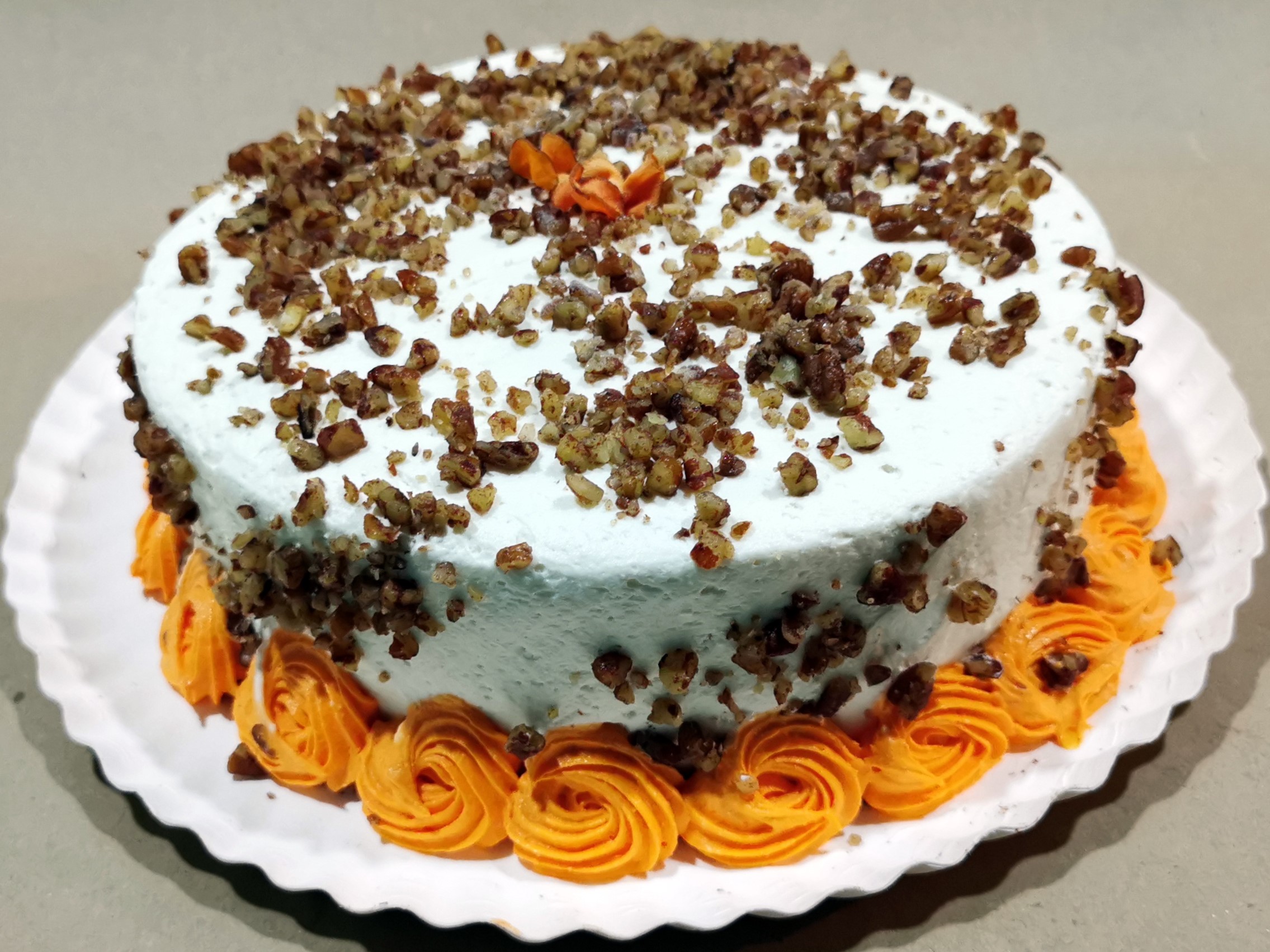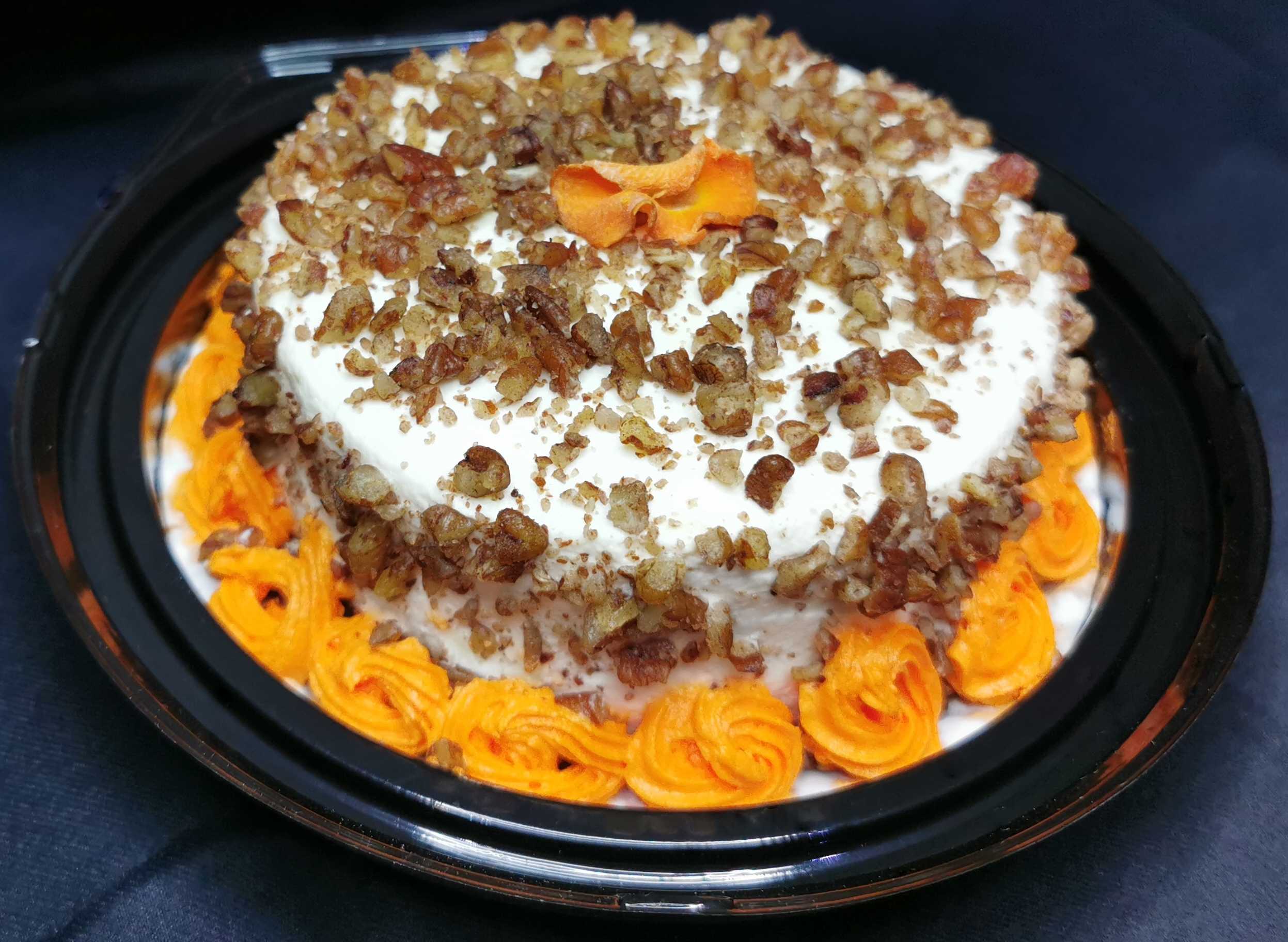 Delicioso y exquisito pan suave con ralladura de zanahoria, piña y nuez picada, relleno de una deliciosa combinación de crema de queso y un toque de licor de café, cubierto con betún de crema de queso y decorado con nuez molida y zanahoria deshidratada.