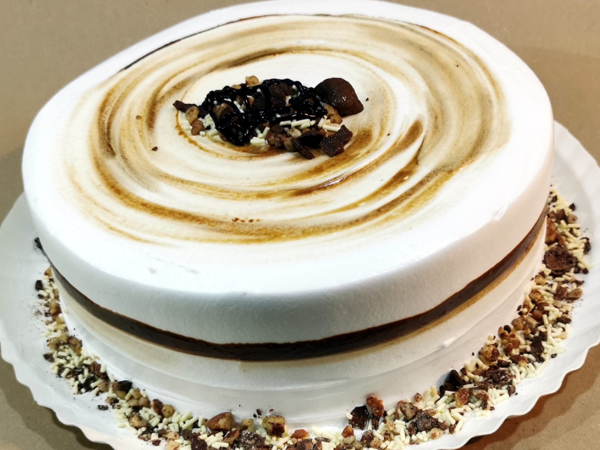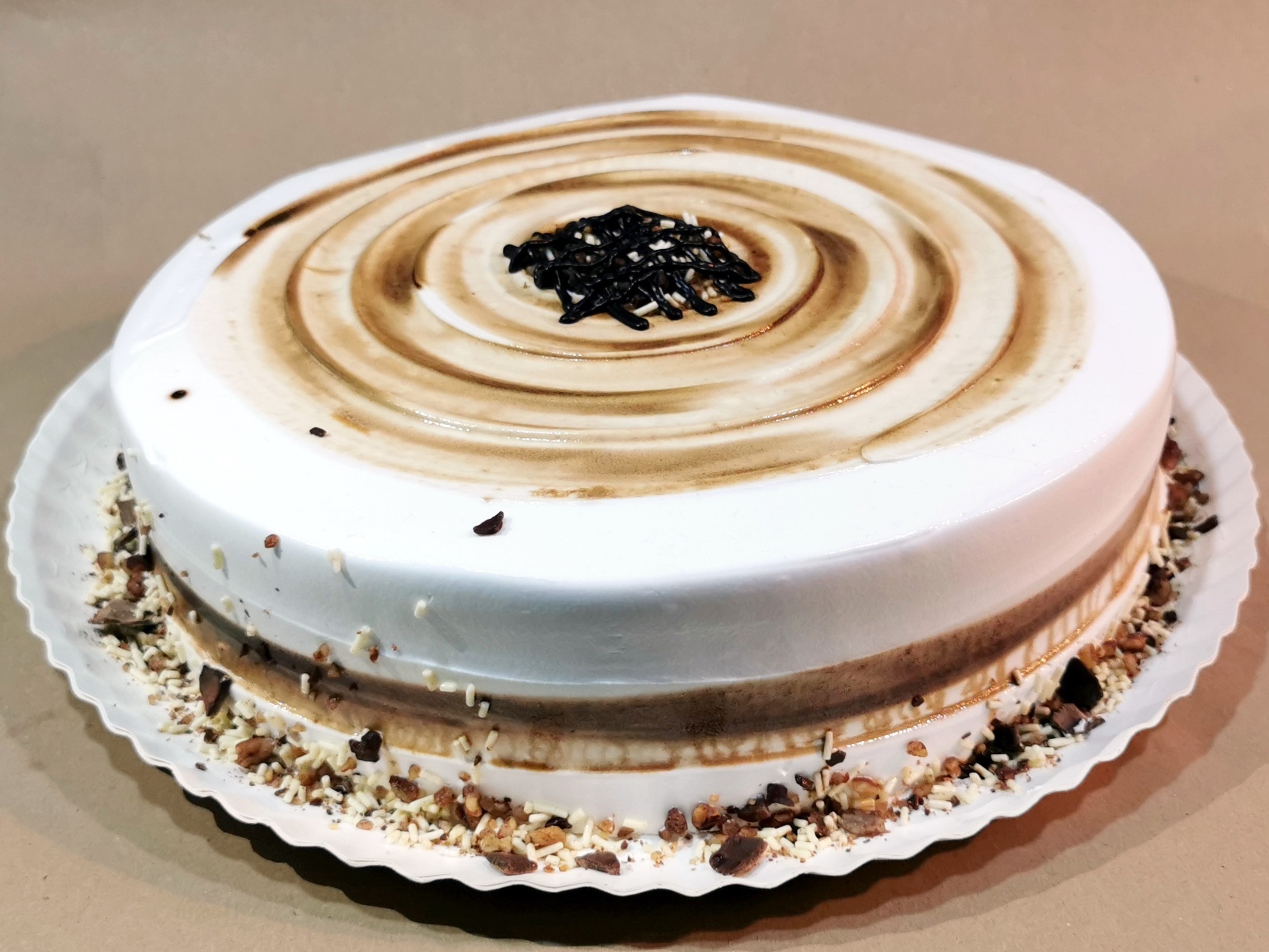 Delicioso pan combinado sabor chocolate y moka, ligeramente mojado con leche semidescremada, relleno de crema de avellana y crema sabor chocolate en forma de espiral , cubierto con una rica crema sabor vainilla, decorado con deliciosas líneas de café, nuez, granillo blanco y chocolate troceado.