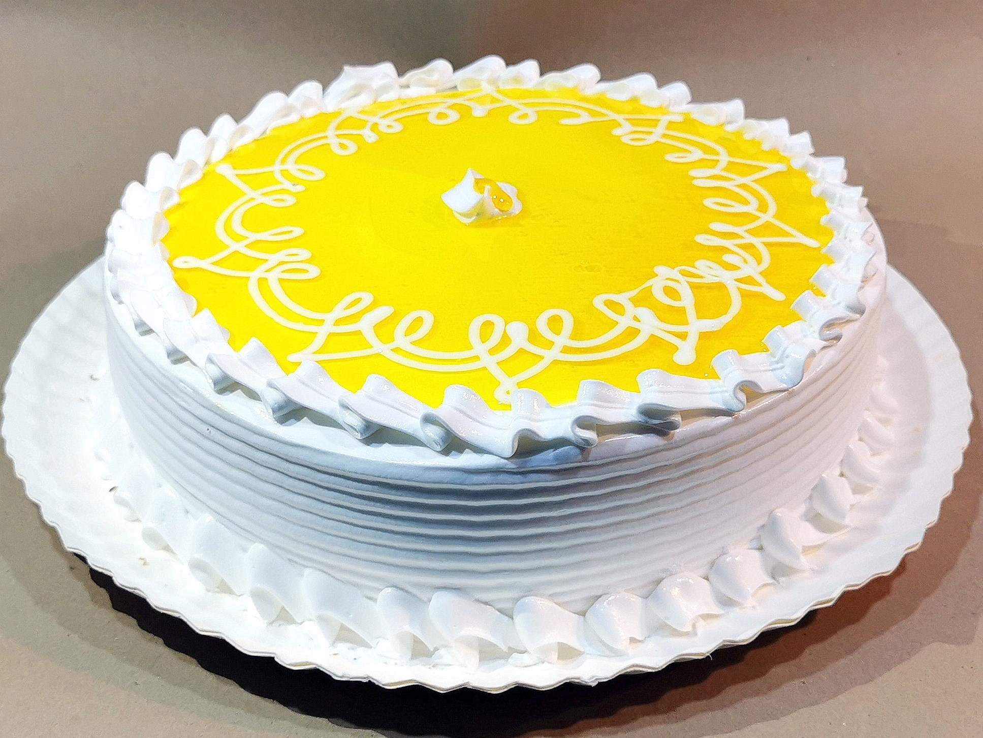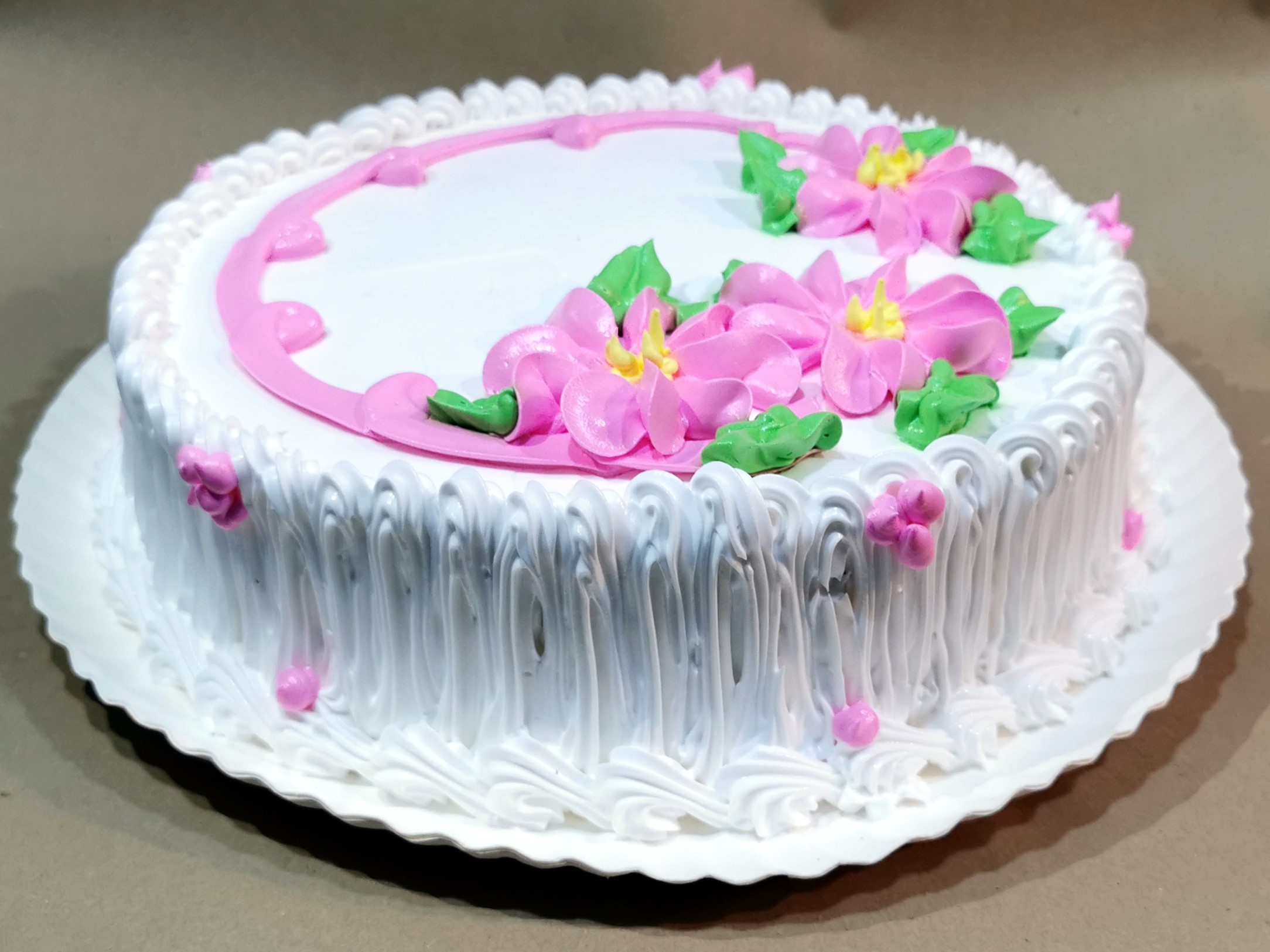 Delicioso y exquisito pan de vainilla mojado en 3 leches, relleno de crema pastelera con toque de ron y vainilla cubierto de riquísima crema y decorado con un cordón en la falda del pastel y dos flores en colores rosa o azul.