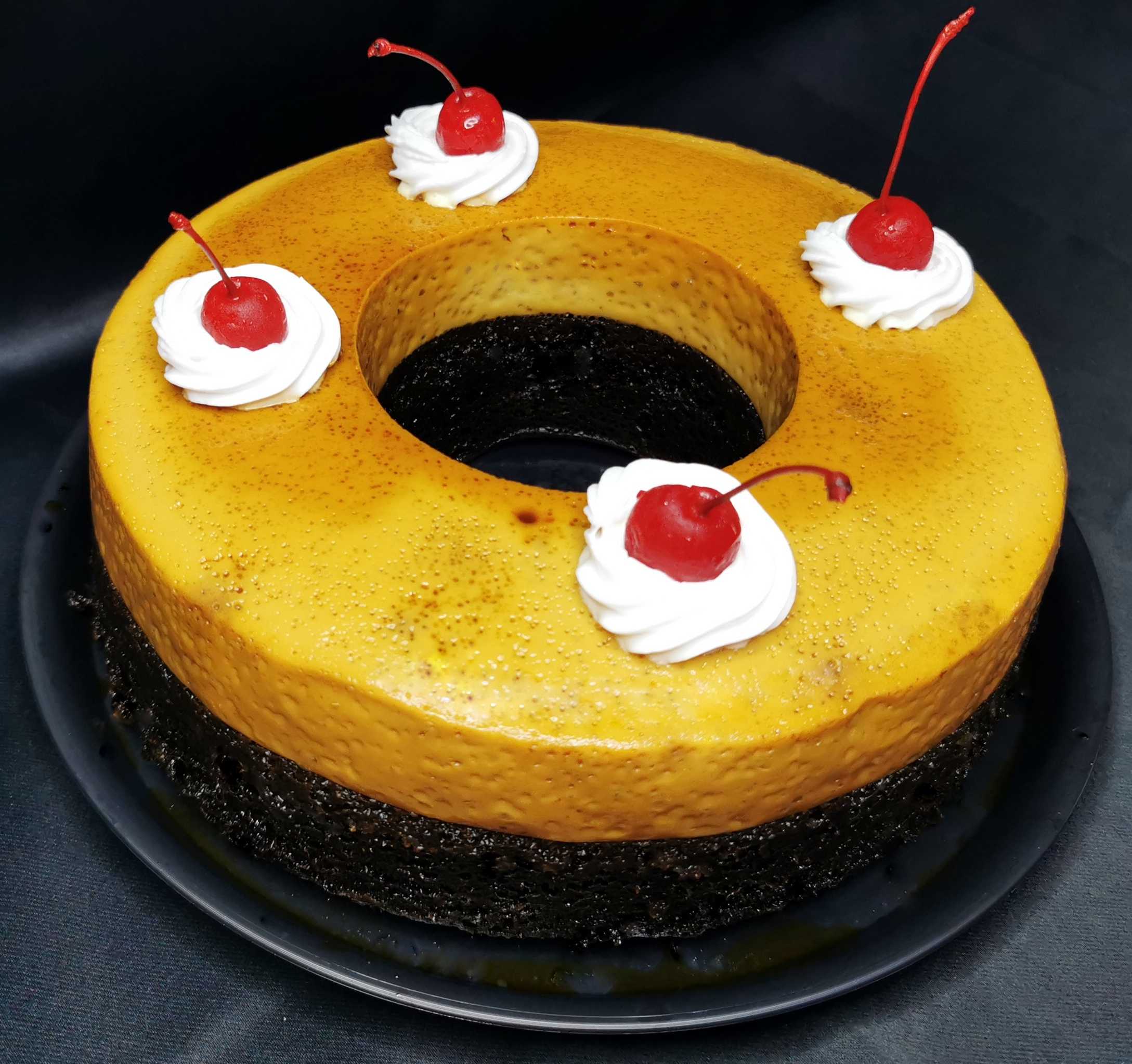 Delicioso y exquisito postre combinando de pan sabor chocolate y flan napolitano, con textura cremosa, húmeda y esponjosa; decorado con rosetas de crema y cerezas.
