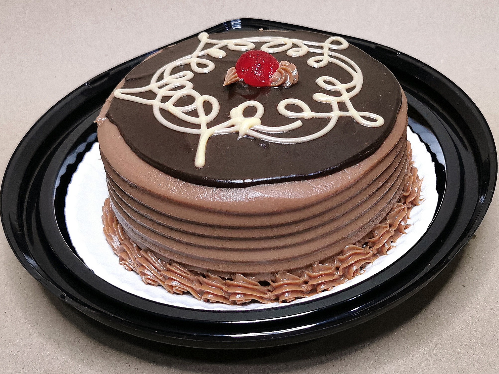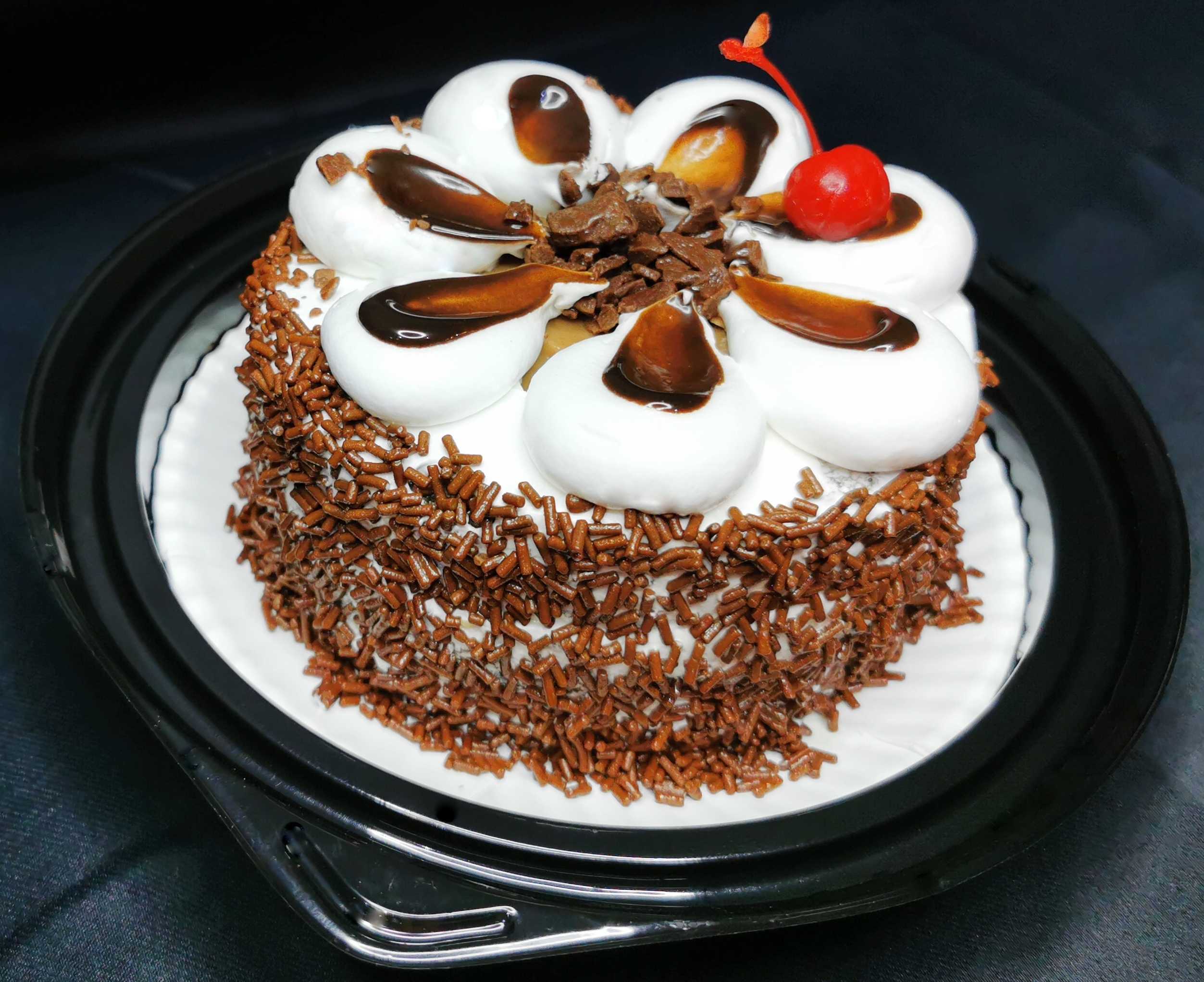 Delicioso y exquisito pan de chocolate, mojado en 3 leches, relleno de fudge (preparación a base de crema pastelera y chocolate real) decorado con granillo sabor chocolate, con un rico centro de chocolate fudge, bombones de crema decorados con chocolate, hojuelas de chocolate y acompañado de cereza.