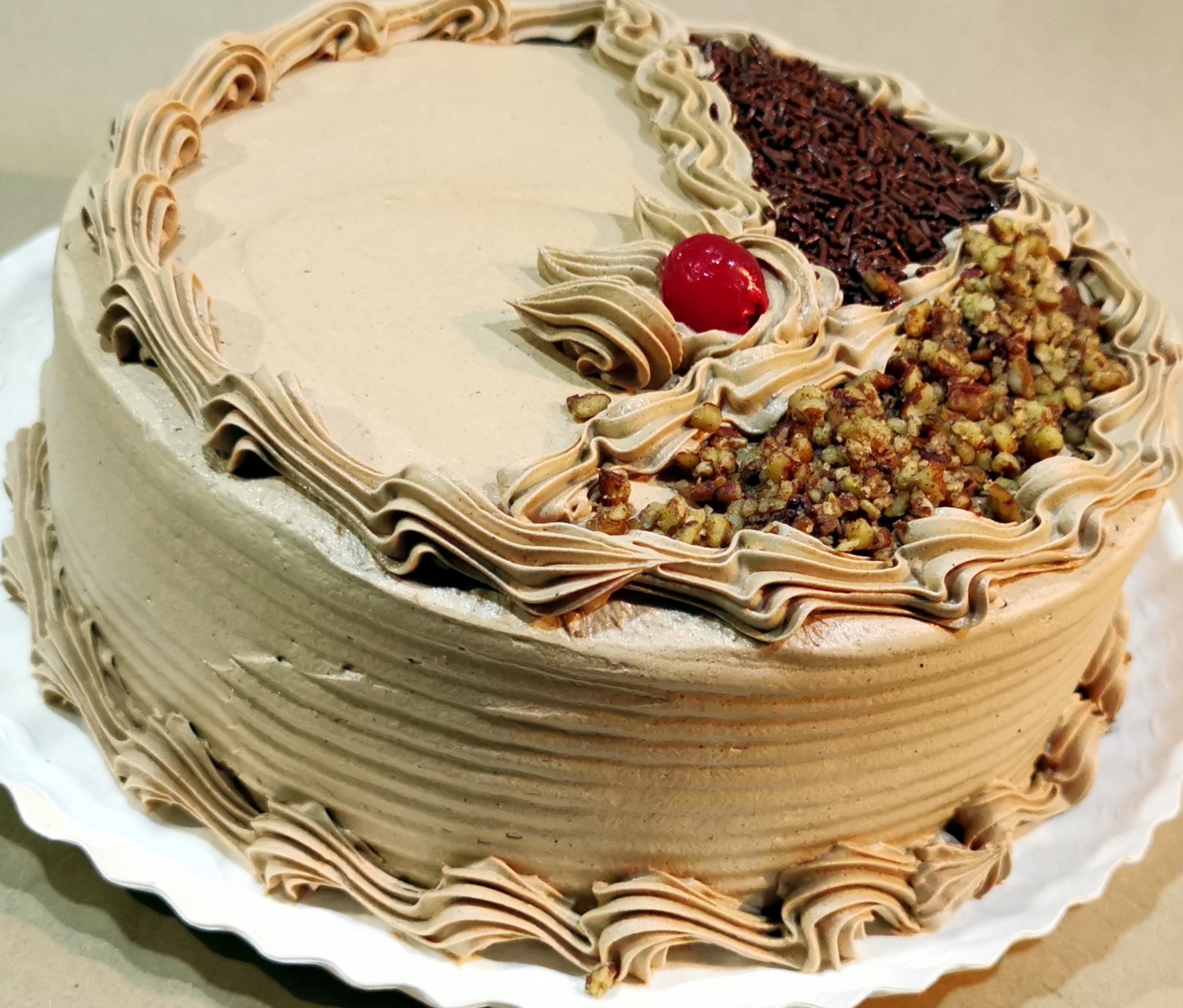 Pan rico, suave de chocolate y nuez, relleno y cubierto de betún de moka, (cocoa, chocolate, margarina y vainilla) espléndidamente detallado con nuez y granillo sabor chocolate