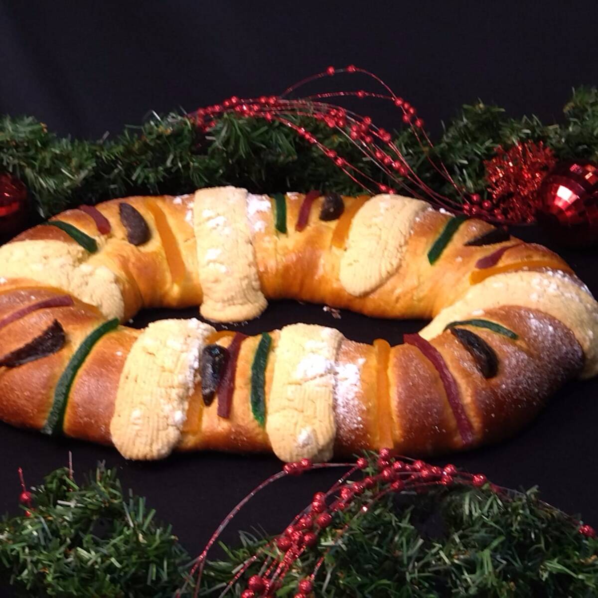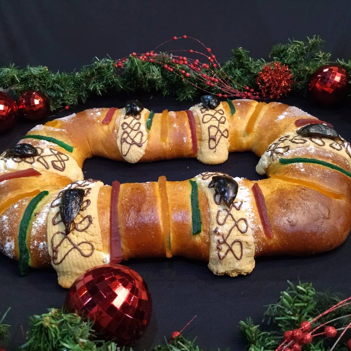 Delicioso pan de mantequilla con textura suave y esponjo en forma de rosca, rellena de queso doble crema. Decorado con higo, acitrón rojo, acitrón verde, acitrón natural, cereza, deliciosas franjas de galleta de mantequilla y escarchada con azucar glas, contiene 6 muñequitos.