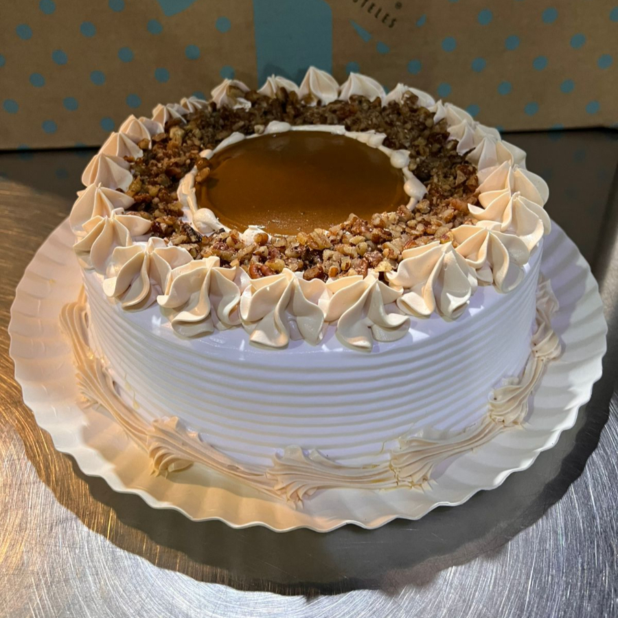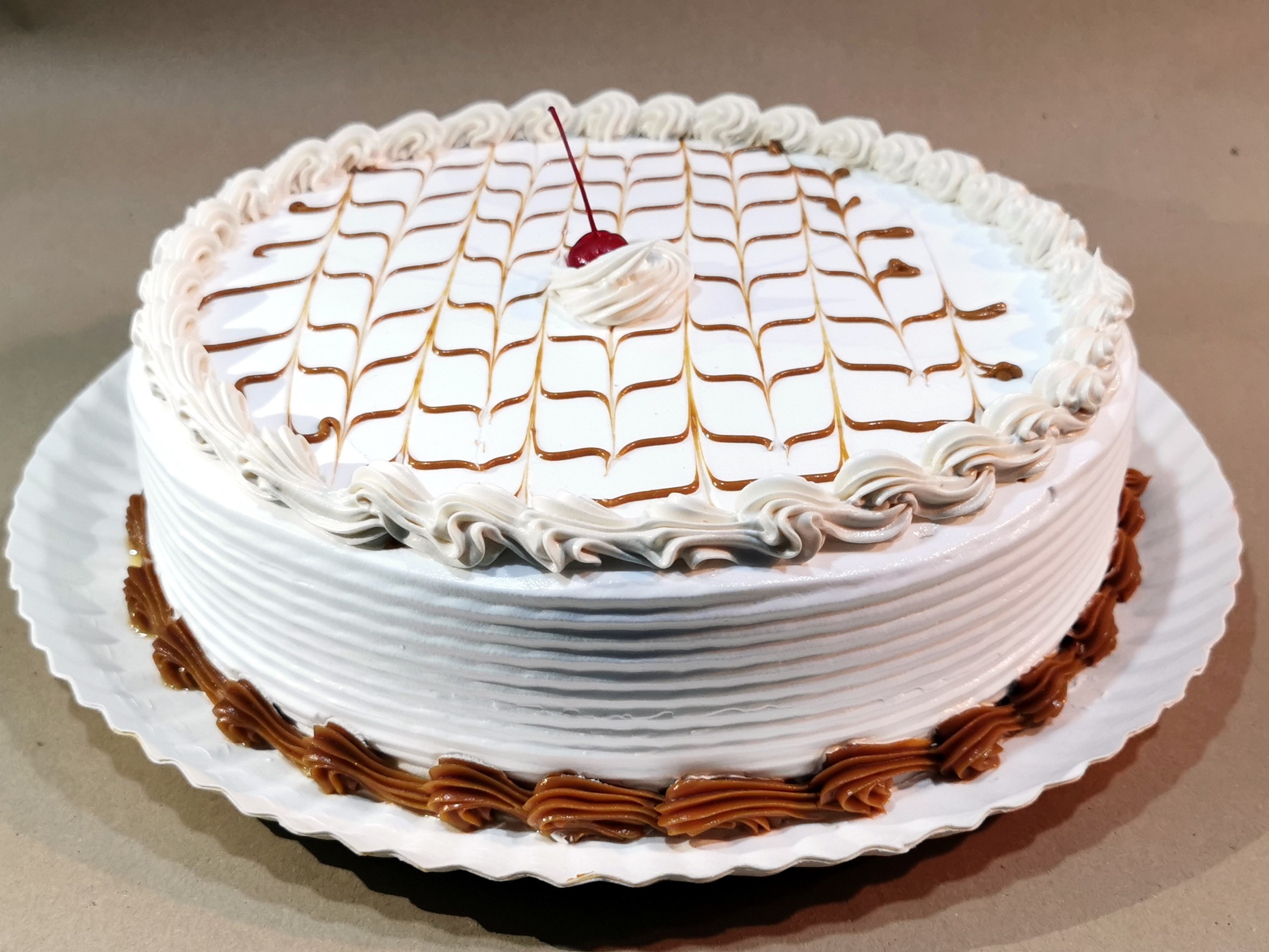 Delicioso y exquisito pan de vainilla mojado en 3 leches sabor vainilla, relleno de crema de cajeta, cubierto de rica crema sabor de vainilla y decorado con un cordón de crema de cajeta y detalles con dulce de leche.