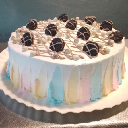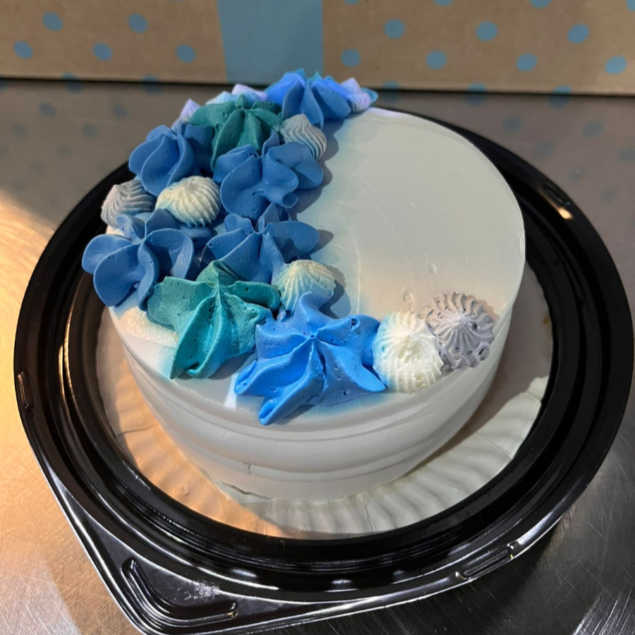 Delicioso y exquisito pan de vainilla mojado en 3 leches, relleno de crema pastelera con toque de ron y vainilla cubierto de riquísima crema y decorado con un cordón en la falda del pastel y dos flores en colores rosa o azul.
