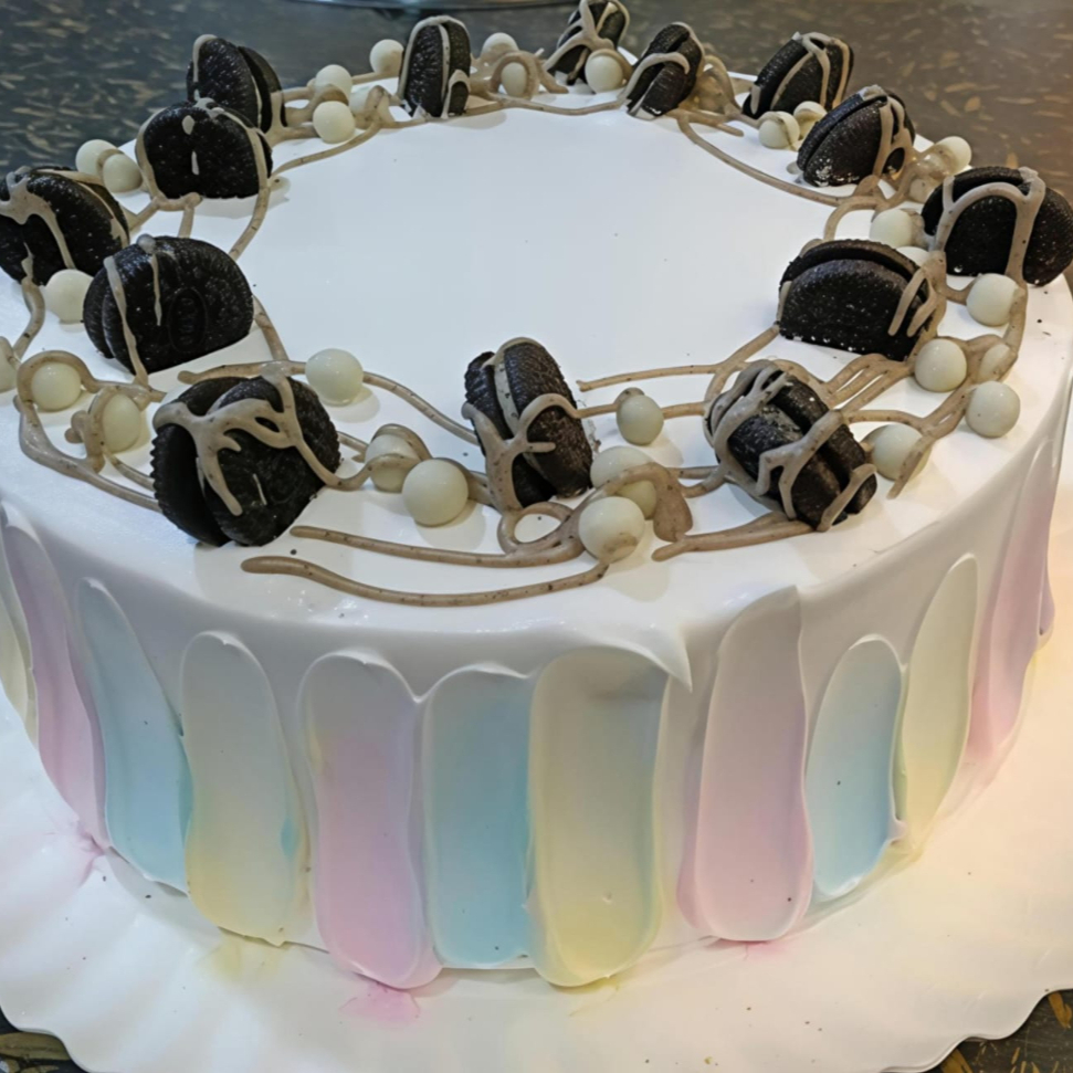 Delicioso y exquisito pan de vainilla mojado en 3 leches, cubierto con crema de vainilla y un delicioso relleno de crema y galleta molida de oreo, decorado con ganache de chocolate y polvo de rica galleta.