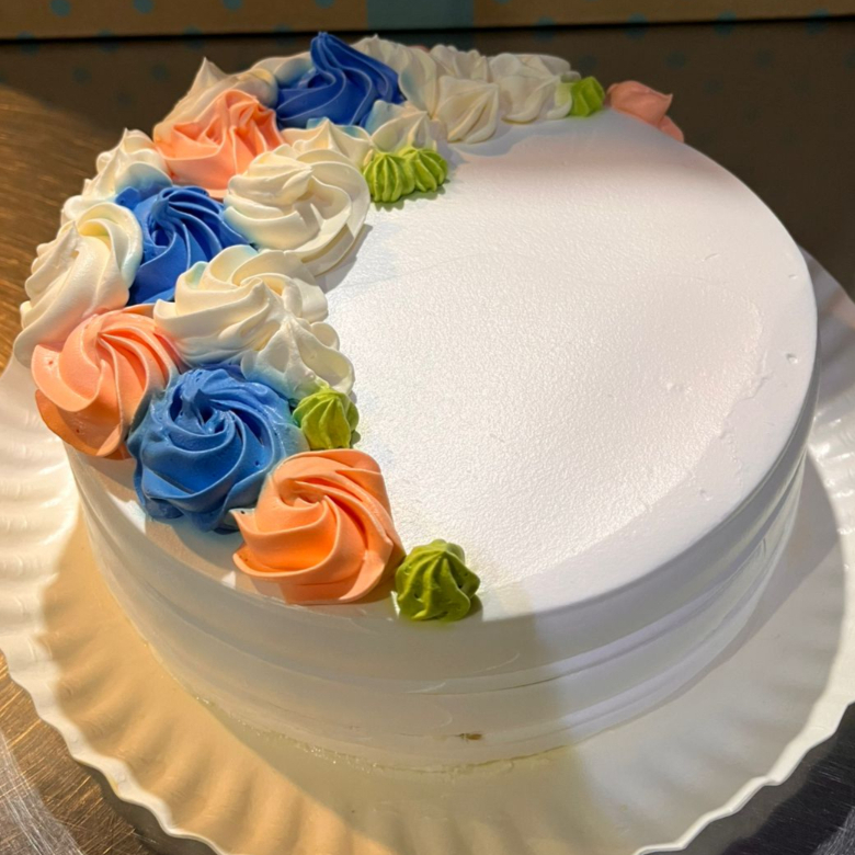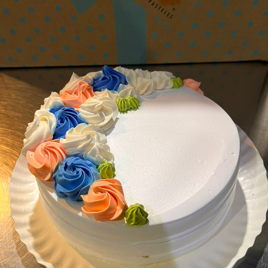 Delicioso y exquisito pan de vainilla mojado en 3 leches, relleno de crema pastelera con toque de ron y vainilla cubierto de riquísima crema y decorado con un cordón en la falda del pastel y dos flores en colores rosa o azul.
