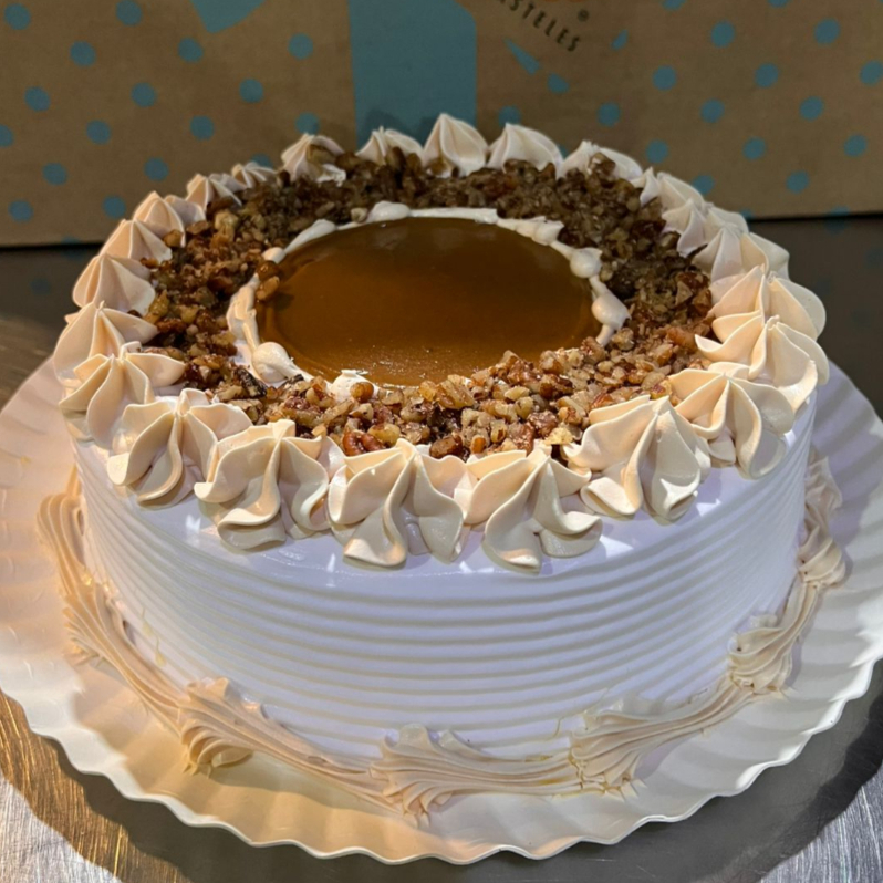 Delicioso y exquisito pan de vainilla mojado en 3 leches sabor vainilla, relleno de crema de cajeta, cubierto de rica crema sabor de vainilla y decorado con un cordón de crema de cajeta y detalles con dulce de leche.