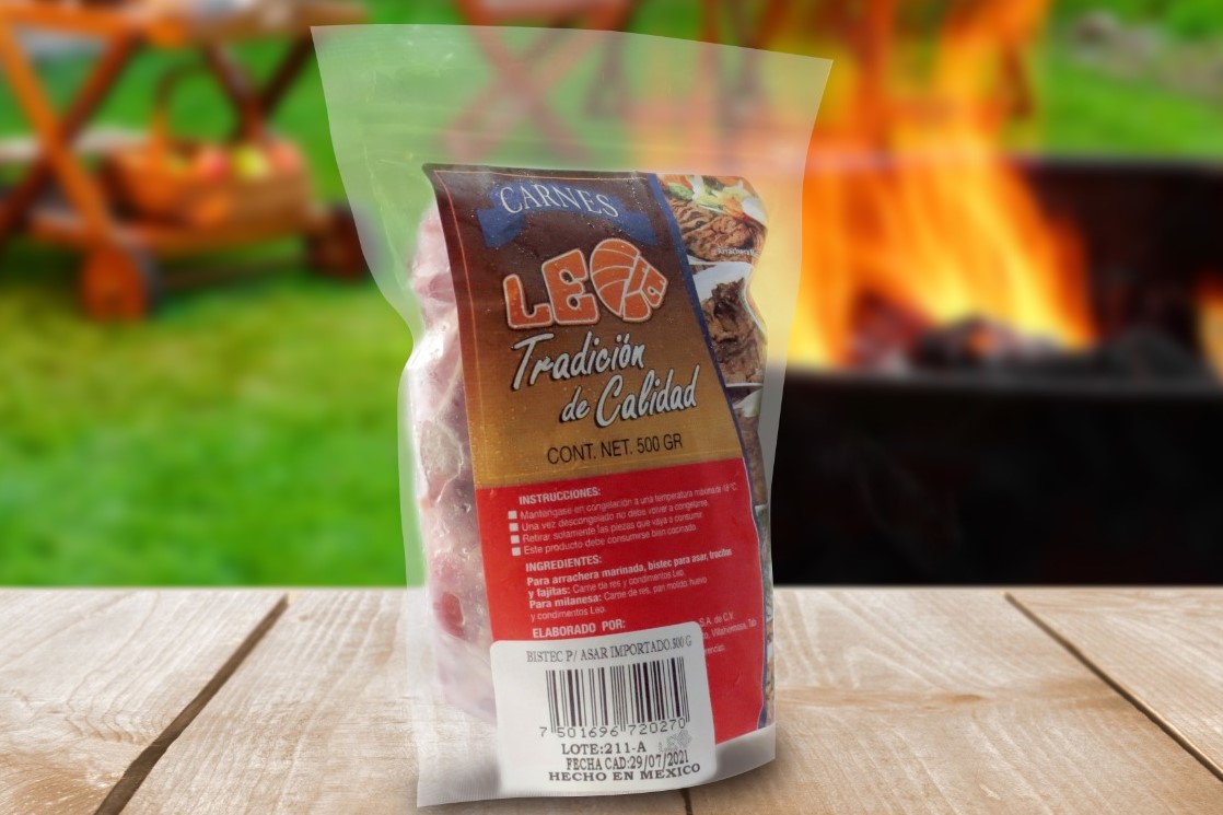 Corte delgado y suave, proviene de la pulpa negra (pierna), marinado con receta LEO, listo para asar.
