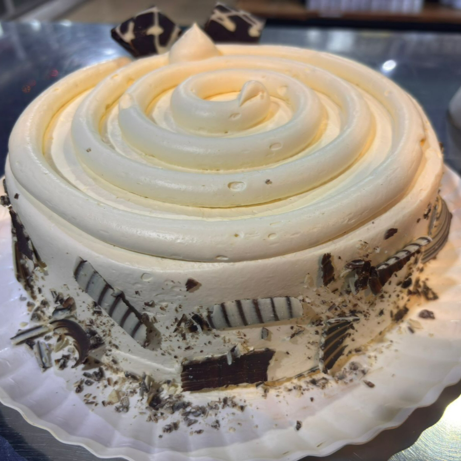 Delicioso Pan de vainilla mojado al 100 % con nuestro exquisito rompope de la casa, relleno y cubierto con una deliciosa crema para café montada con una mezcla de rompope de la casa; decorado con chocolate Blanco y Chocolate semi-amargo (CACEP) en forma de hojuelas en la falda
