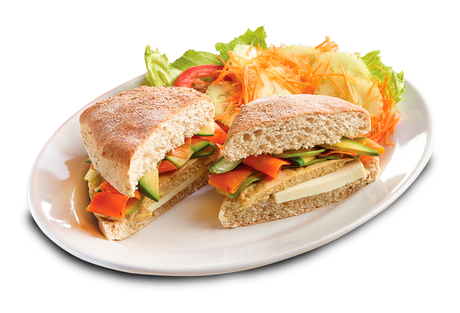 Chapata horneada, rellena de pechuga de pollo a la plancha, queso panela, aguacate y verduras asadas.