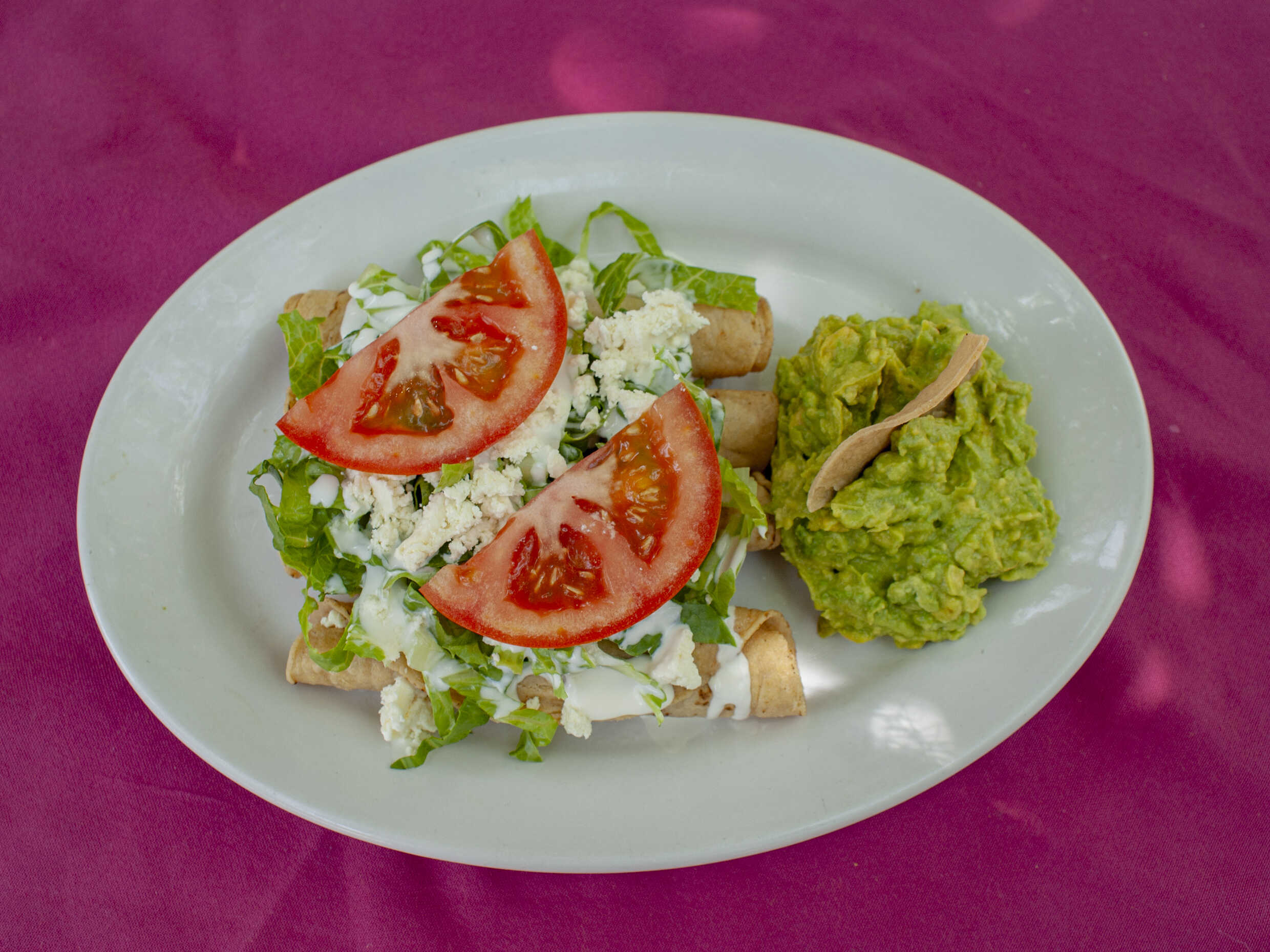 Doradas de Pollo con lechuga, queso, crema y Guacamole