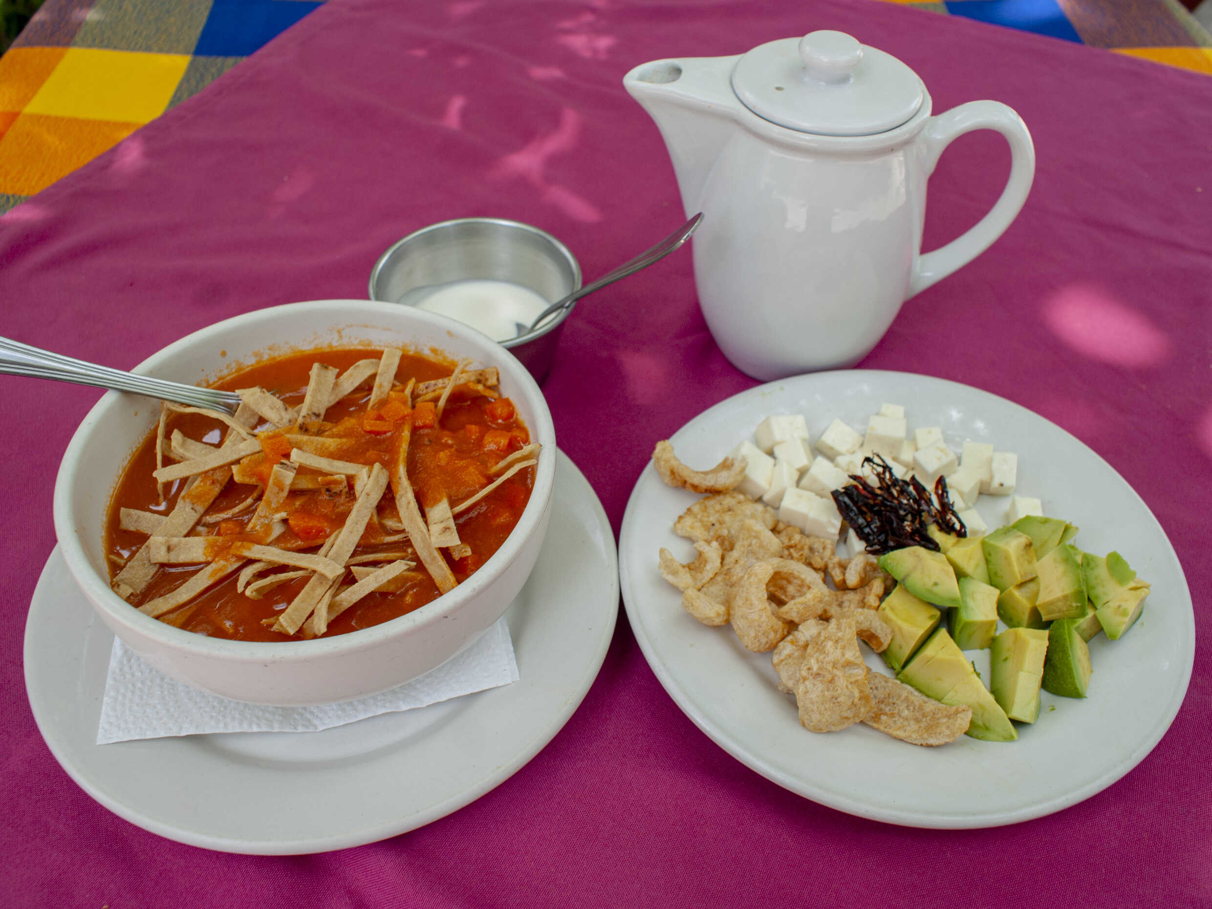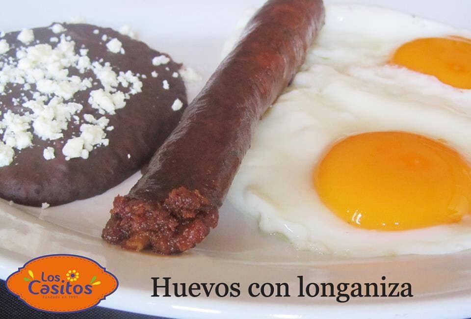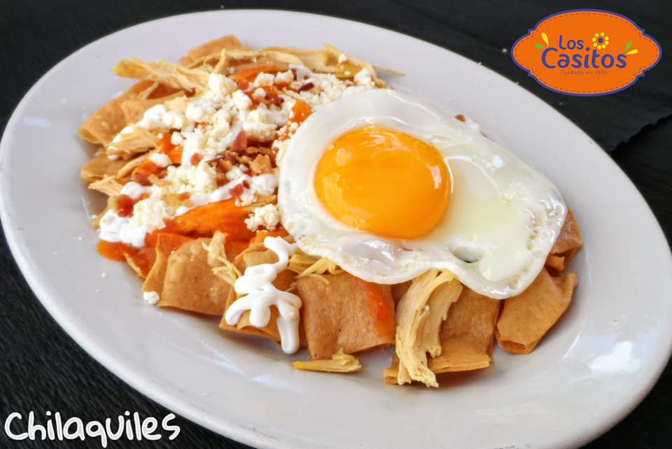 Totopos fritos bañados en salsa de tomate, con trocitos de tocino, pollo desmenusado, huevo estrellado, con crema y queso fresco.