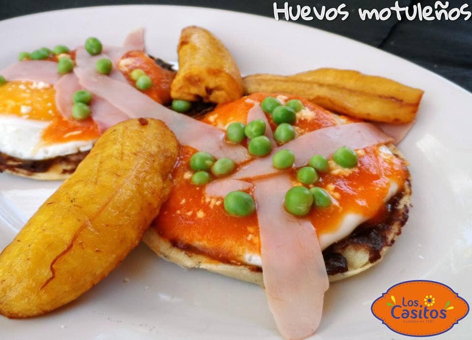 2 huevos estilo motuleño con tiritas de jamon platano frito y chicharos.