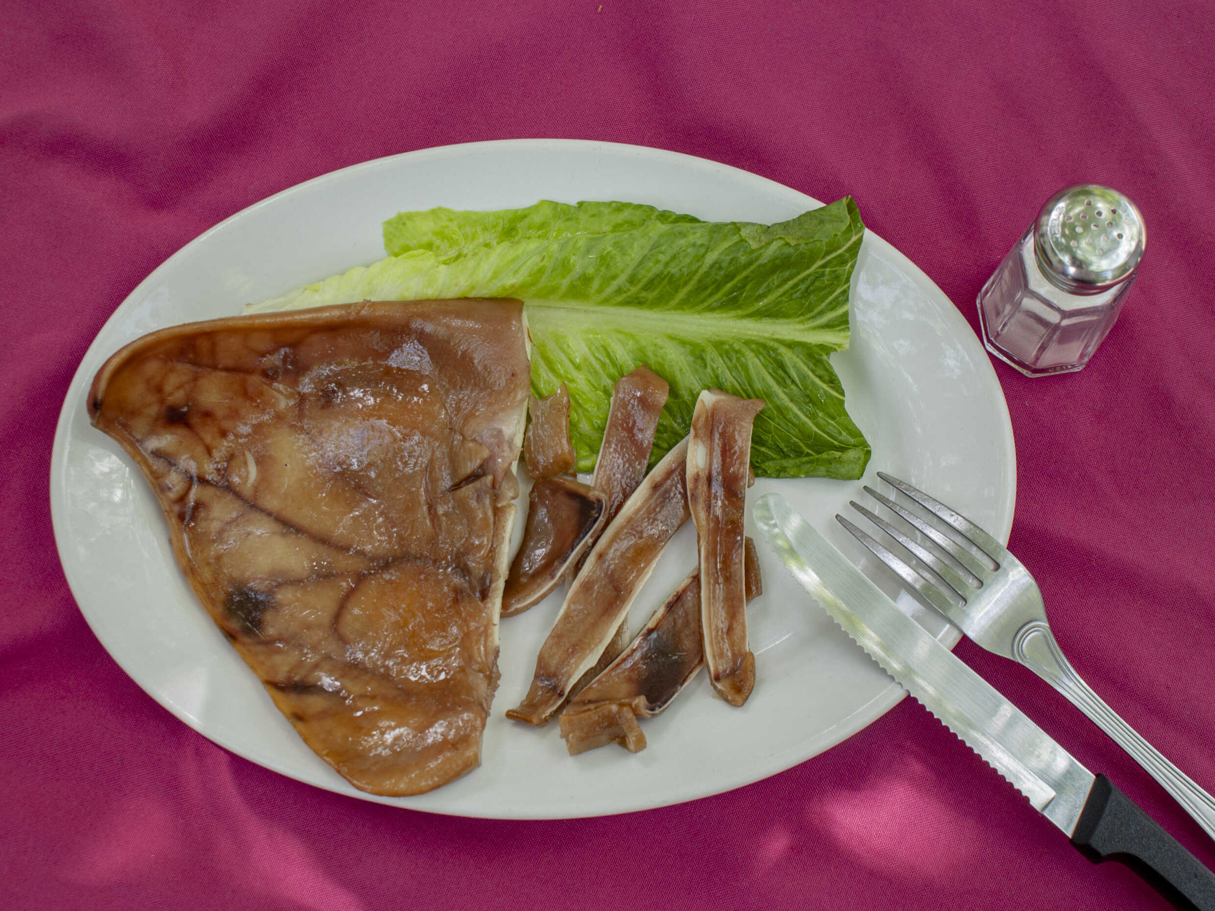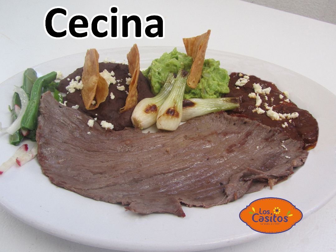 Fina sabada de Cecina de res con guanición de: Ensalada de nopales, cebollitas asadas, guacamole, frijoles refritos y chiles toreados. Tortillas y salsa.