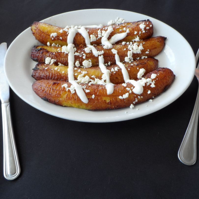Charola con 4 tiras de platanos fritos incluyen queso y crema.