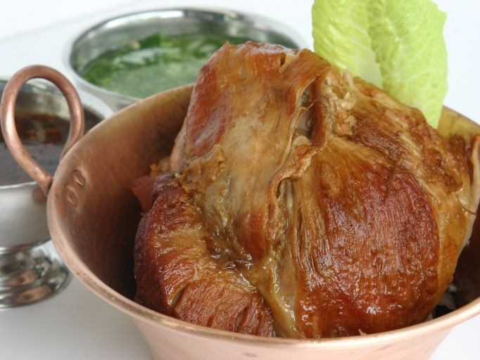 Chamorro de cerdo en carnitas, nuestra especialidad. Incluye salsa y tortillas
