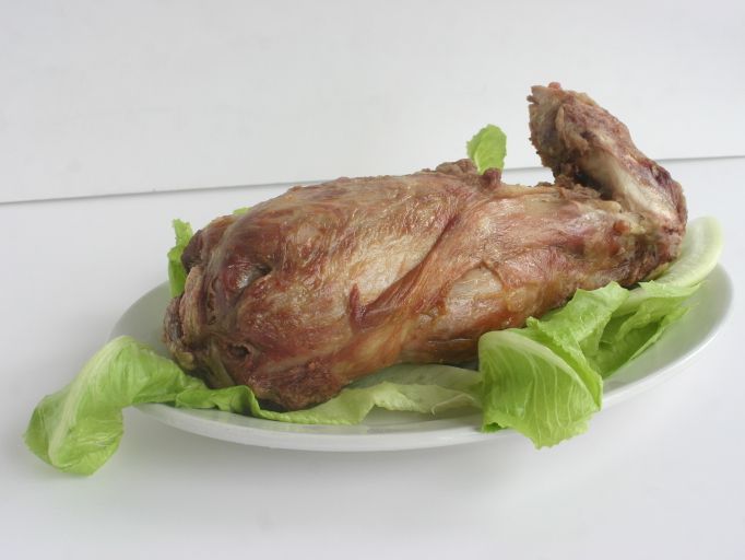 Chamorro horneado al Romero con Ensalada alemana de papas, Crotones Jugo Concentrado.