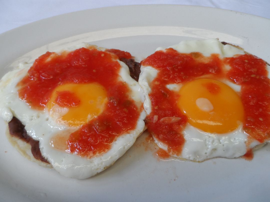 2 huevos estrellados sobre una tortilla pochada cubierta de frijoles, bañados con salsa de tomate y queso fresco.