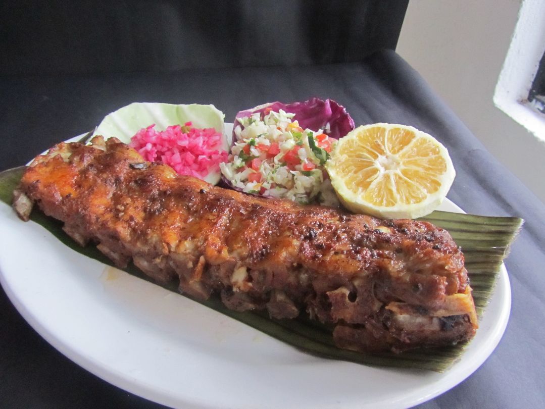 1 Costilla de cerdo Marinada con todos los secretos de la cocina de la peninsula y su jugo concentrado, con ensalada de repollo y tomate, cebolla morada y Chile Habanero, Naranja Agria asada.