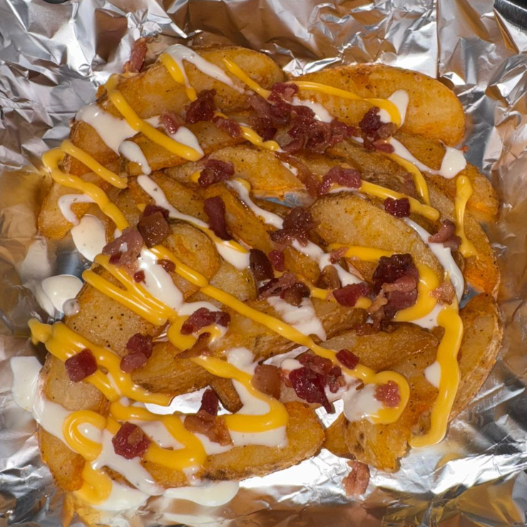 200 gr de papas gajo acompañadas de ranch, queso y tocino