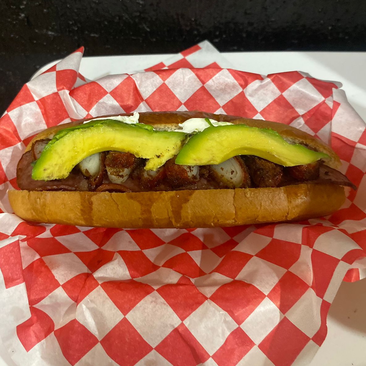 salchicha de res, tocino, surimi empanizado, queso philadelphia y aguacate