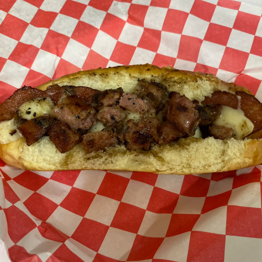 salchicha de pavo, tocino, carne de sirloin y queso americano