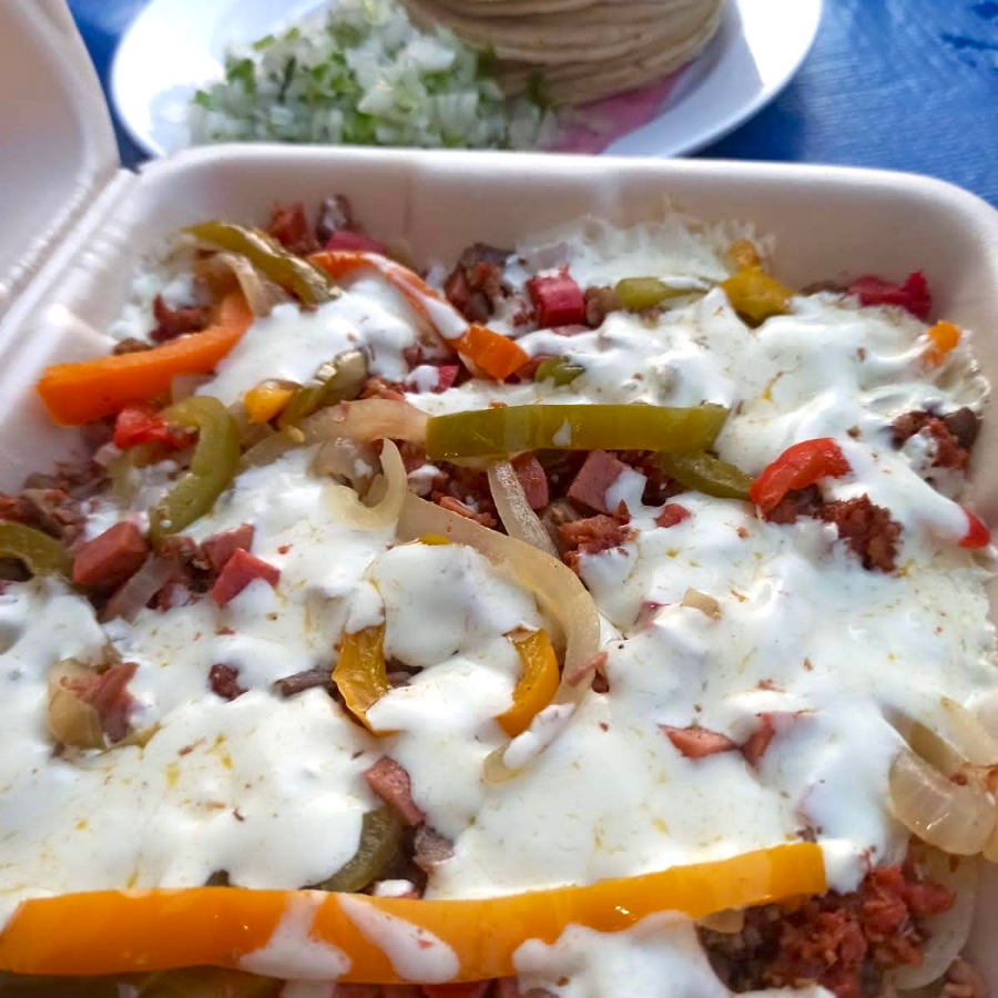 550gr de Pastor, asada, longaniza, salchicha para asar morrones y queso fundido.