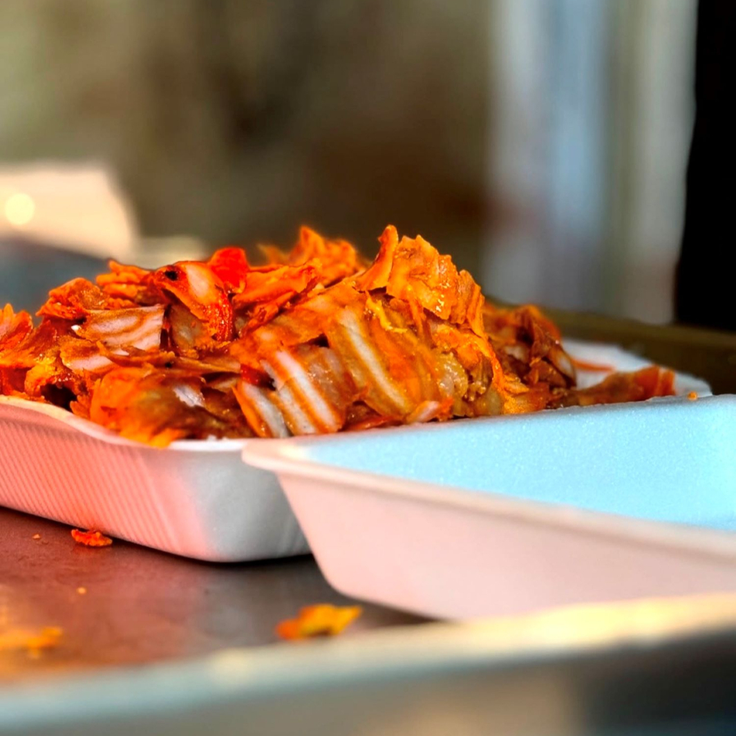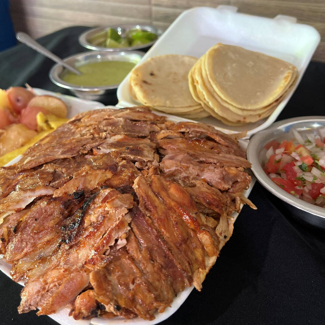 Deliciosa carne al pastor acompañado de tortiilas y salsas.