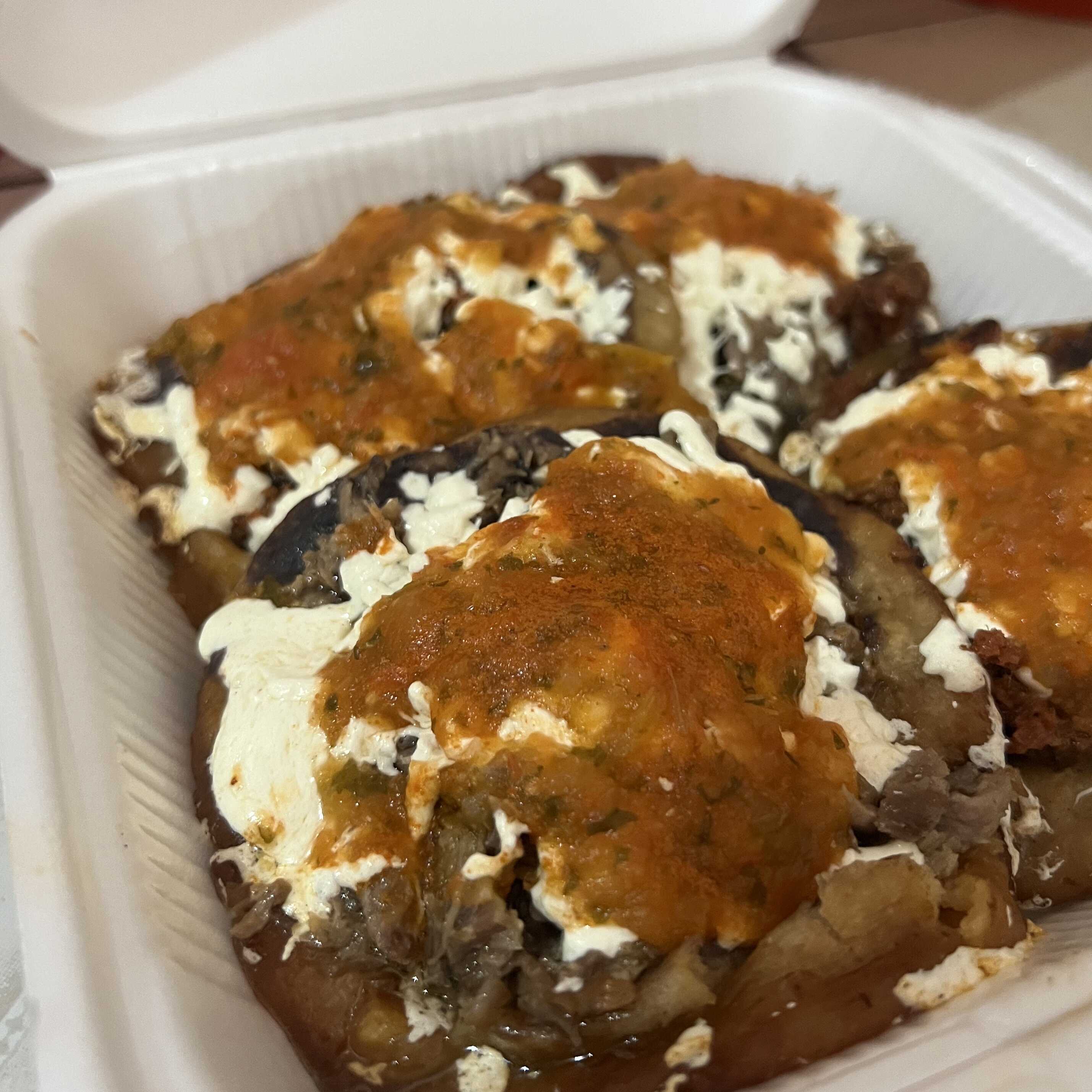 Puré de papa con carne al pastor y asada y queso fundido
