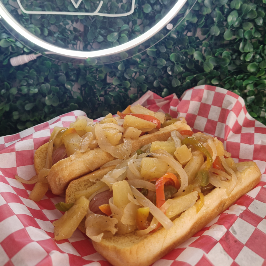 2 pz de nuestros dogos Hawallanos (Pan, Mayonesa, Salchicha de pavo, Cebolla Asada, Morrón Asado, Piña y Queso mozzarella)