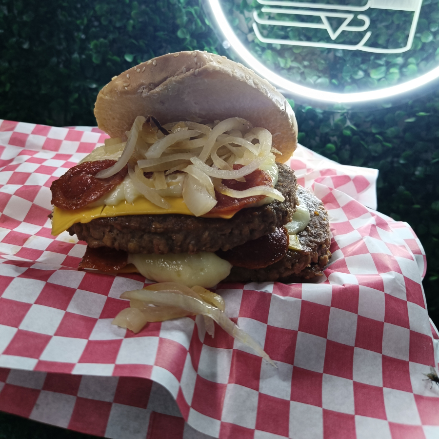 Pan, Mayonesa, Doble carne de sirloin, Doble cama de pepperoni con queso mozzarella, Cebolla asada