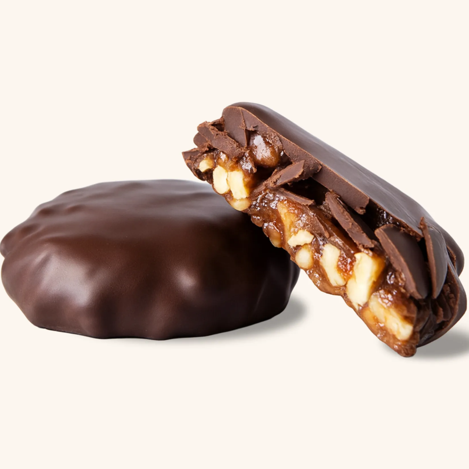 Deliciosa combinación de chocolate con caramelo chiclosito vegano, nuez pecana para darle crunch y un toque de sal.