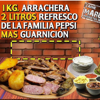 1 kg De arrachera, 1 refresco 2 L más guarniciones (orden de arroz o frijol, salsa, tortillas, papa horneada, cebolla, jalapeño toreado y bolillo con aderezo de ajo).
