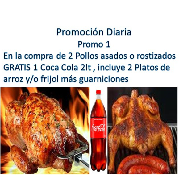 2 Pollos, 1 refresco 2 L coca cola, 2 platos de arroz o frijol y guarniciones (orden de arroz o frijol, salsa, tortillas, papa horneada, cebolla, jalapeño toreado y bolillo con aderezo de ajo).