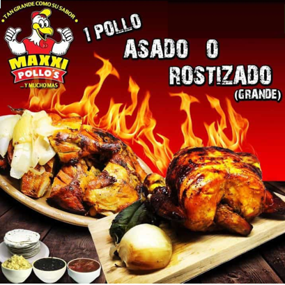 1 Pollo asado o rostizado más guarniciones (orden de arroz o frijol, salsa, tortillas, papa horneada, cebolla, jalapeño toreado y bolillo con aderezo de ajo).