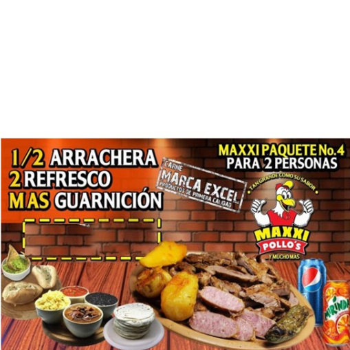 1/2 kg De arrachera, 2 refrescos en lata sabor más guarniciones (orden de arroz o frijol, salsa, tortillas, papa horneada, cebolla, jalapeño toreado y bolillo con aderezo de ajo).